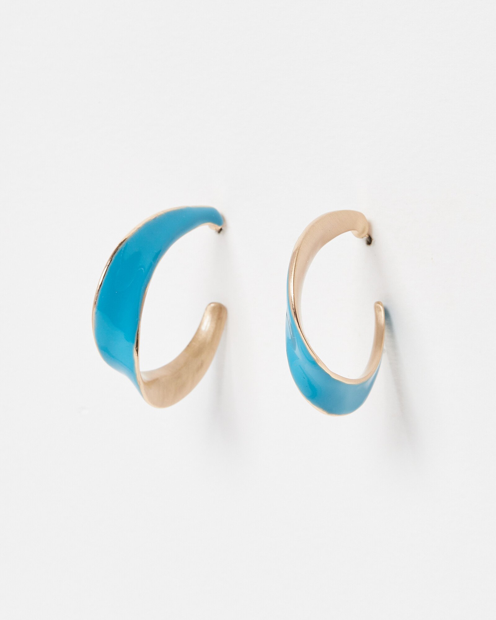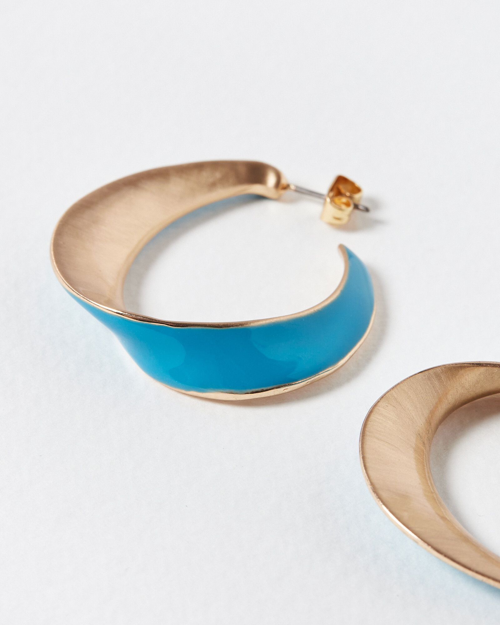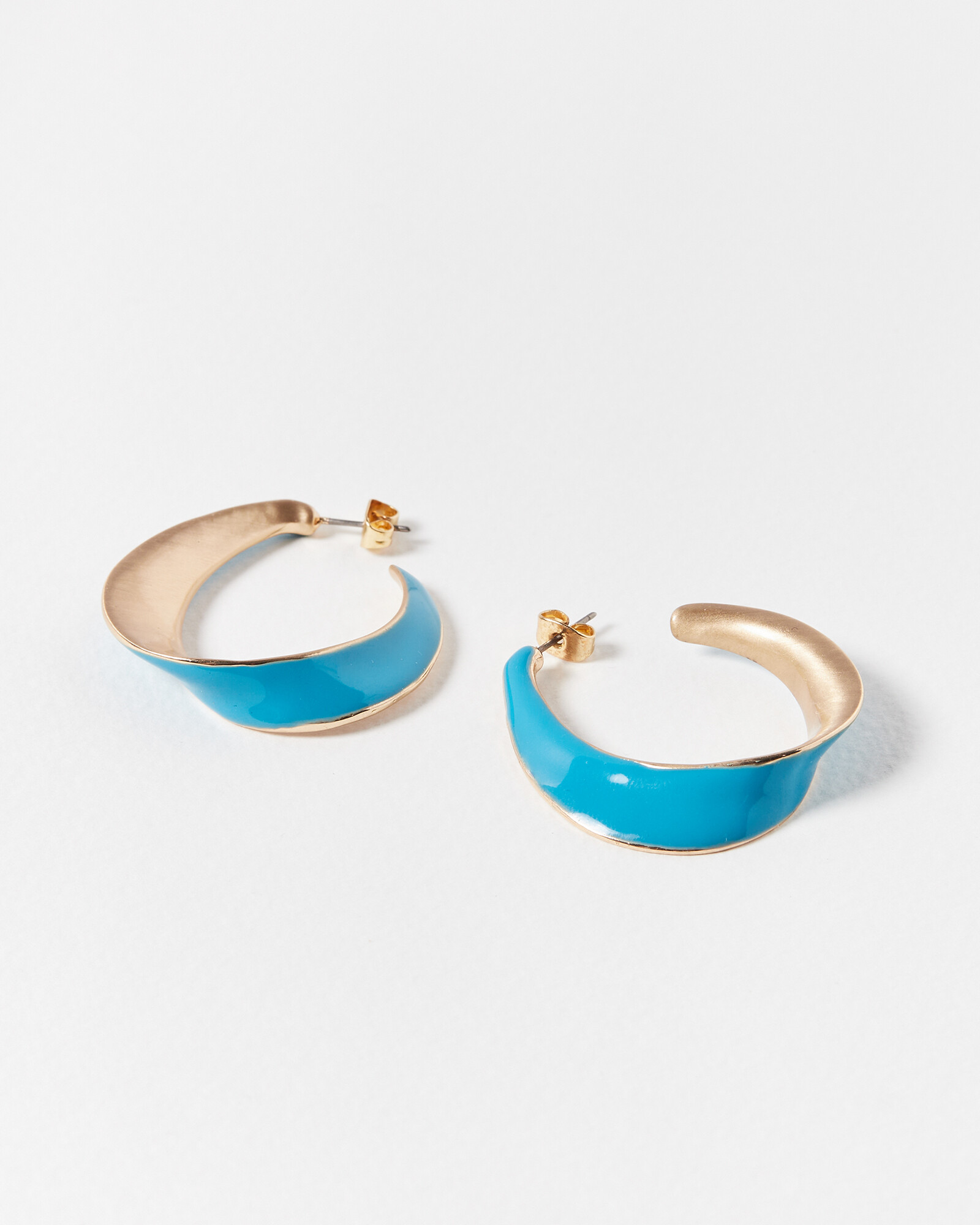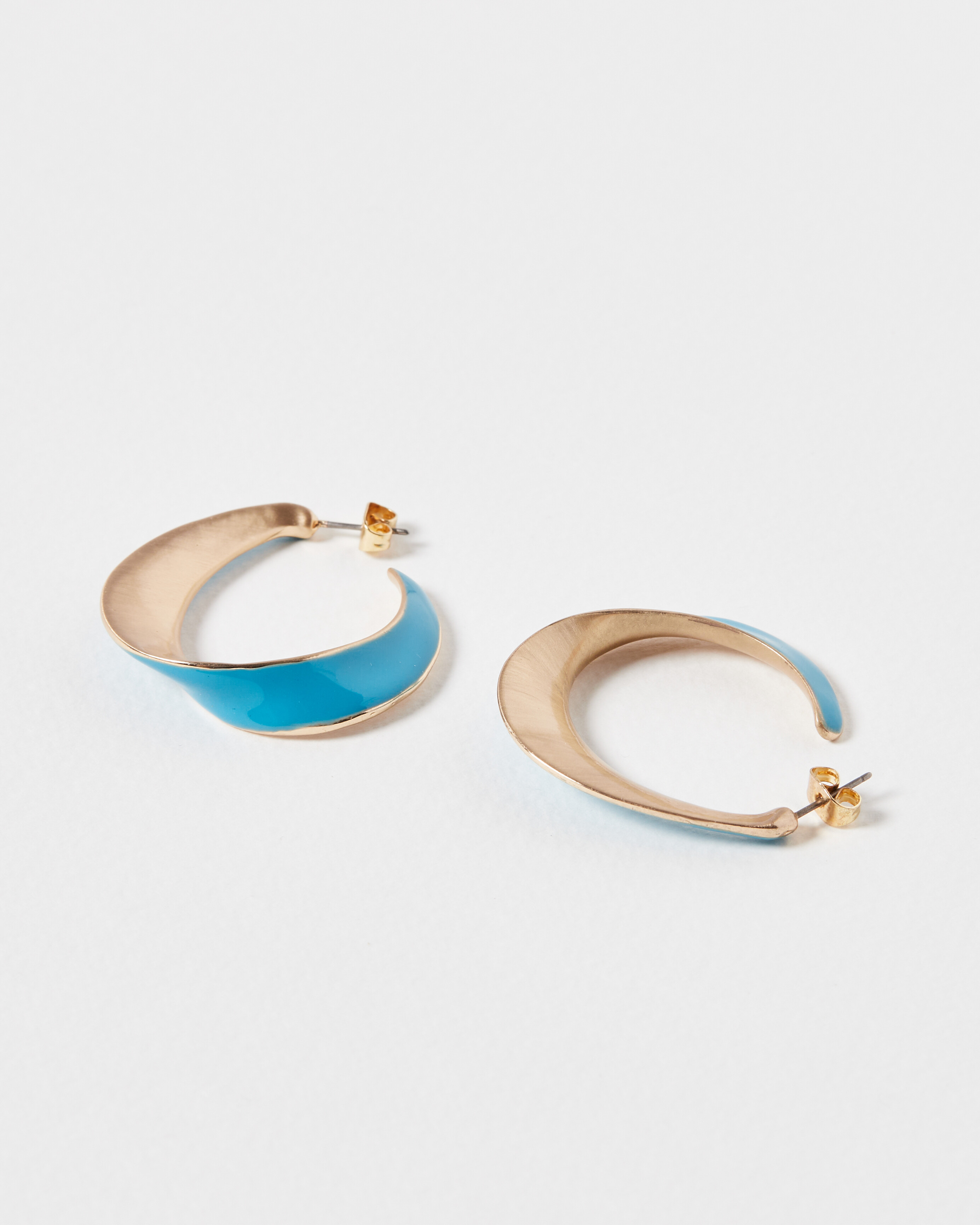 With a gentle twist, the Roxanne Hoop Earrings have a blue enamel and golden finish, suspended from stud backs.