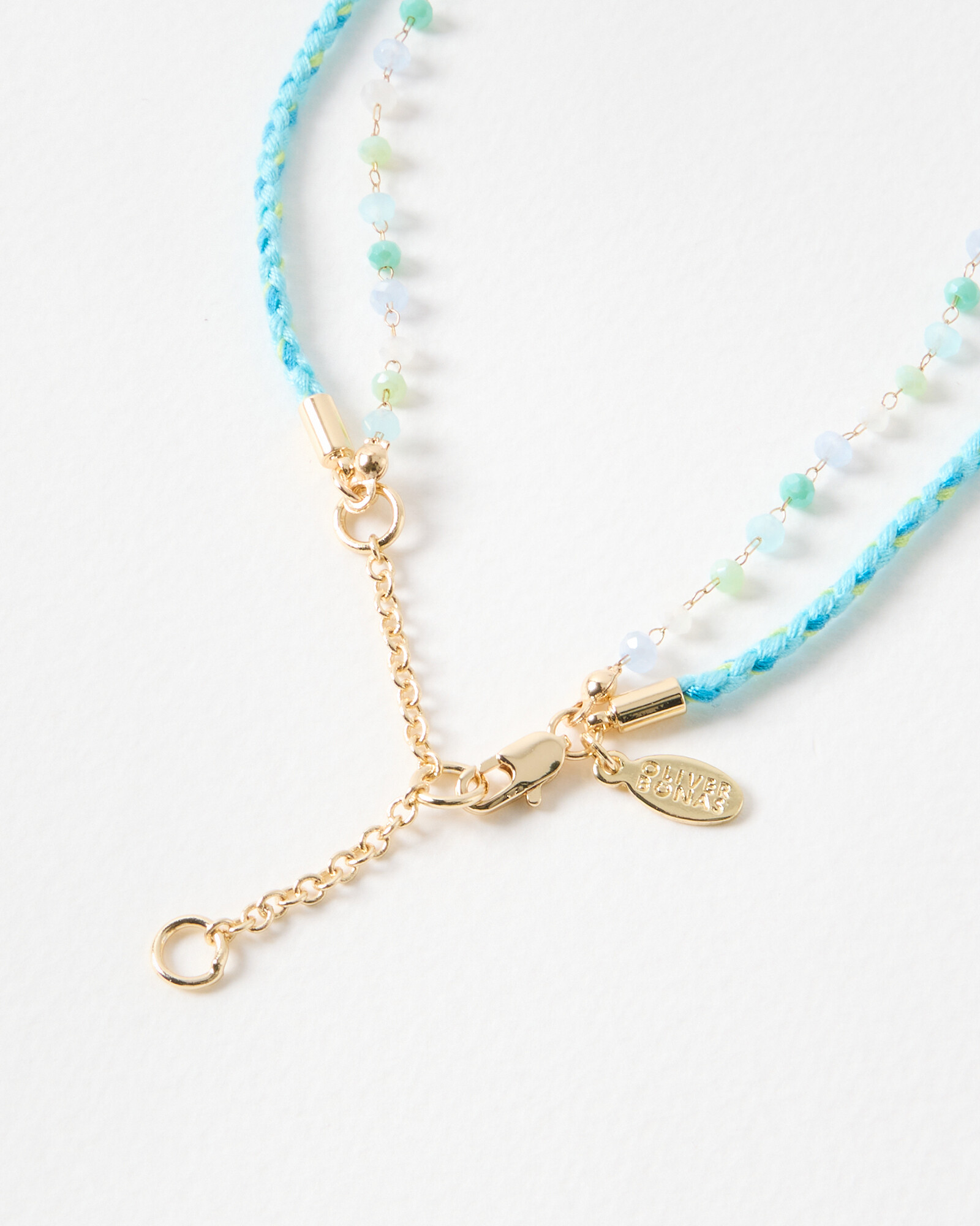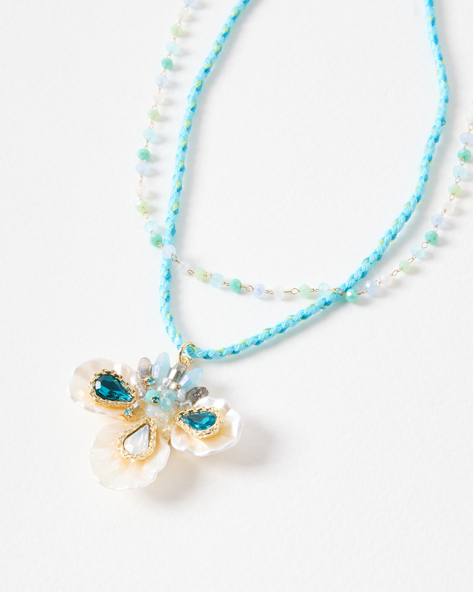 Double row statement necklace featuring a short beaded chain necklace dotted with green, blue and clear stones, and a large pendant on a woven blue and yellow cord. The pendant sits in a floral profile, with large faux-pearl petals, multiple blue beads and teardrop stones set in a gold-toned metal base. Pair with the matching Serena Statement Pearl Earrings to complete the set.