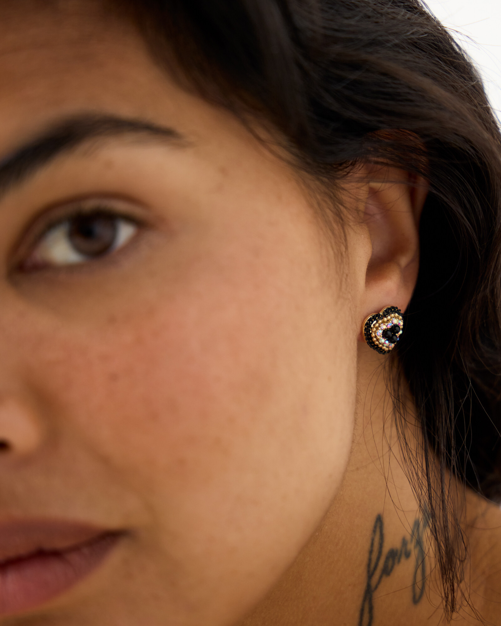 Heart shaped stud earrings inlaid with rows of black, clear and gold toned beads, with a trio of central black stones and subtle black chain outline. Style these heart earrings with other black and gold jewellery pieces, or use to add sparkle to your party outfits.