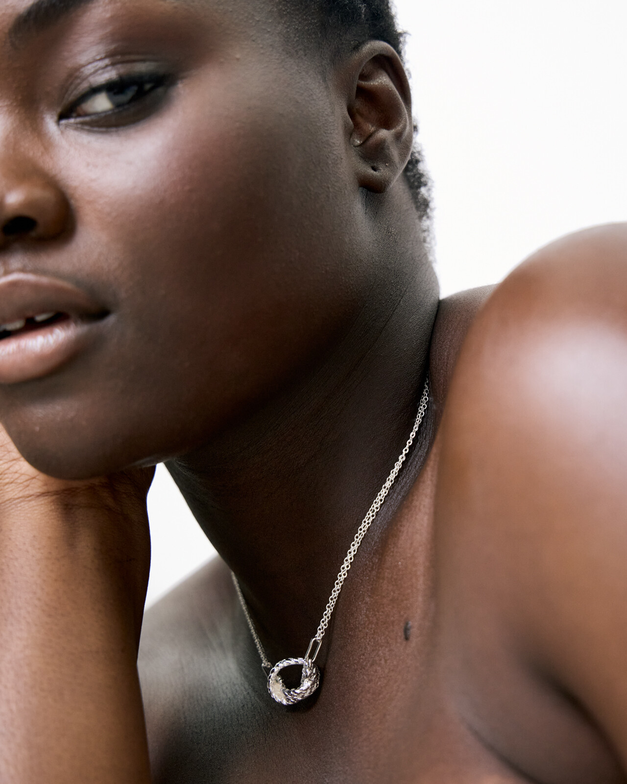 Double stranded necklace in a silver-toned metal with a large textured rope knot pendant. Features an adjustable lobster clasp fastening with three loops to wear at your preferred length. Style with silver earrings and bracelets for a cohesive look.