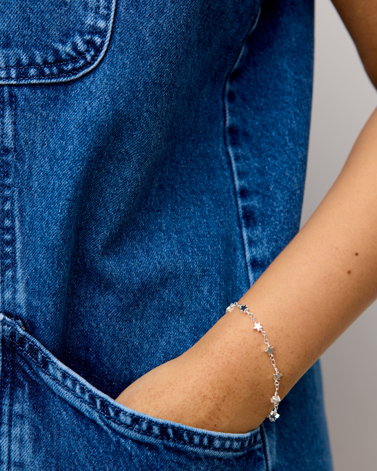 This silver toned chain bracelet features tiny star charm links and an adjustable lobster clasp for comfortable wear. Style with other star jewellery pieces or pair with the Taurus necklace to complete the look.