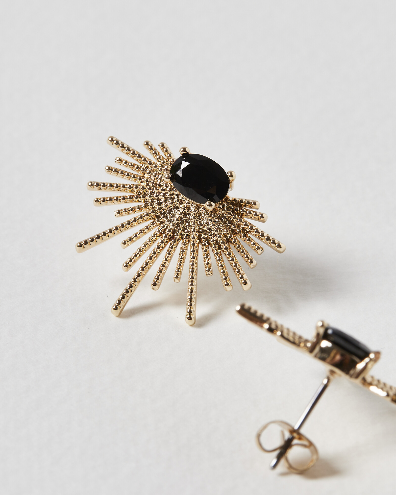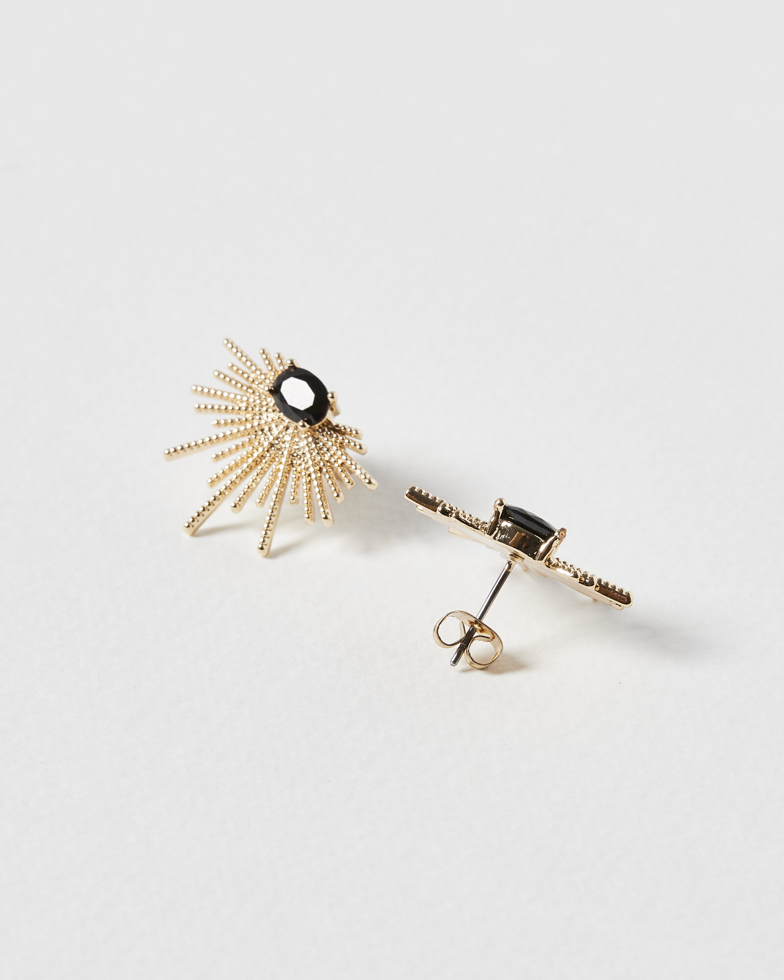 Fan-shaped stud earrings with textured bars and black gem at the centre.