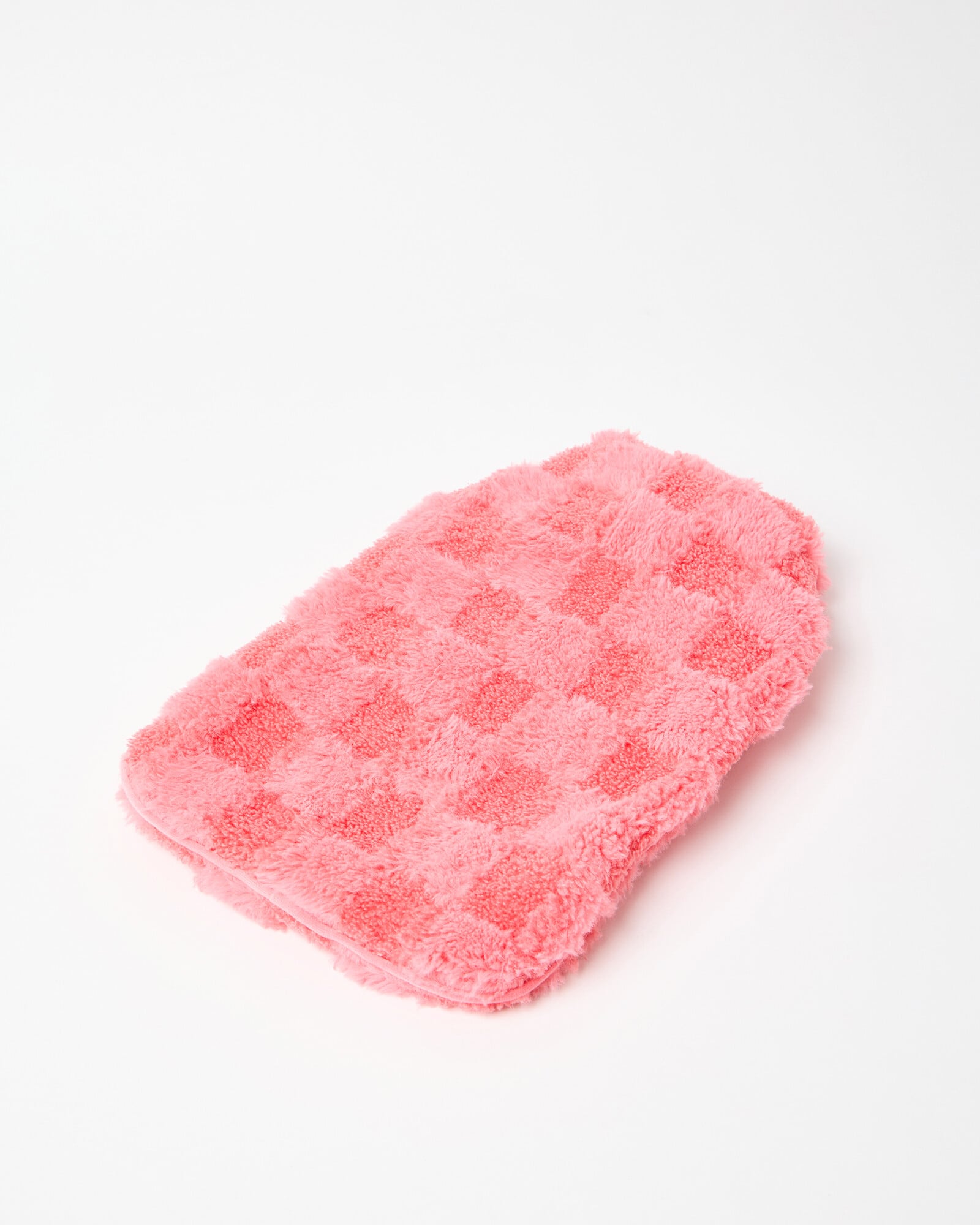 Faux fur hot water bottle with a fluffy tonal pink chequerboard pattern.