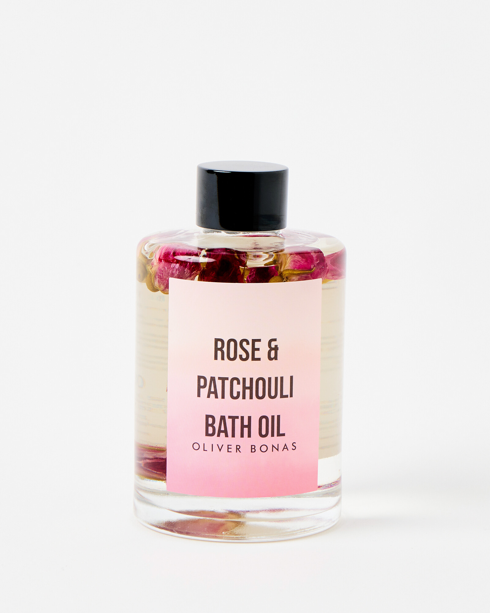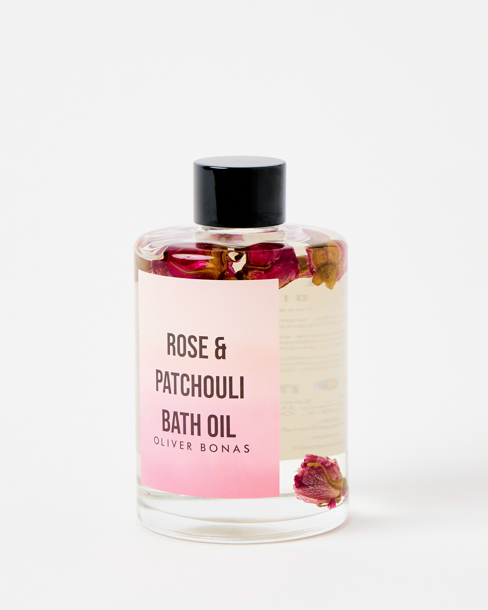 Calming bath oil scented with rose and patchouli and infused with small rose buds, poured into a recyclable glass bottle.