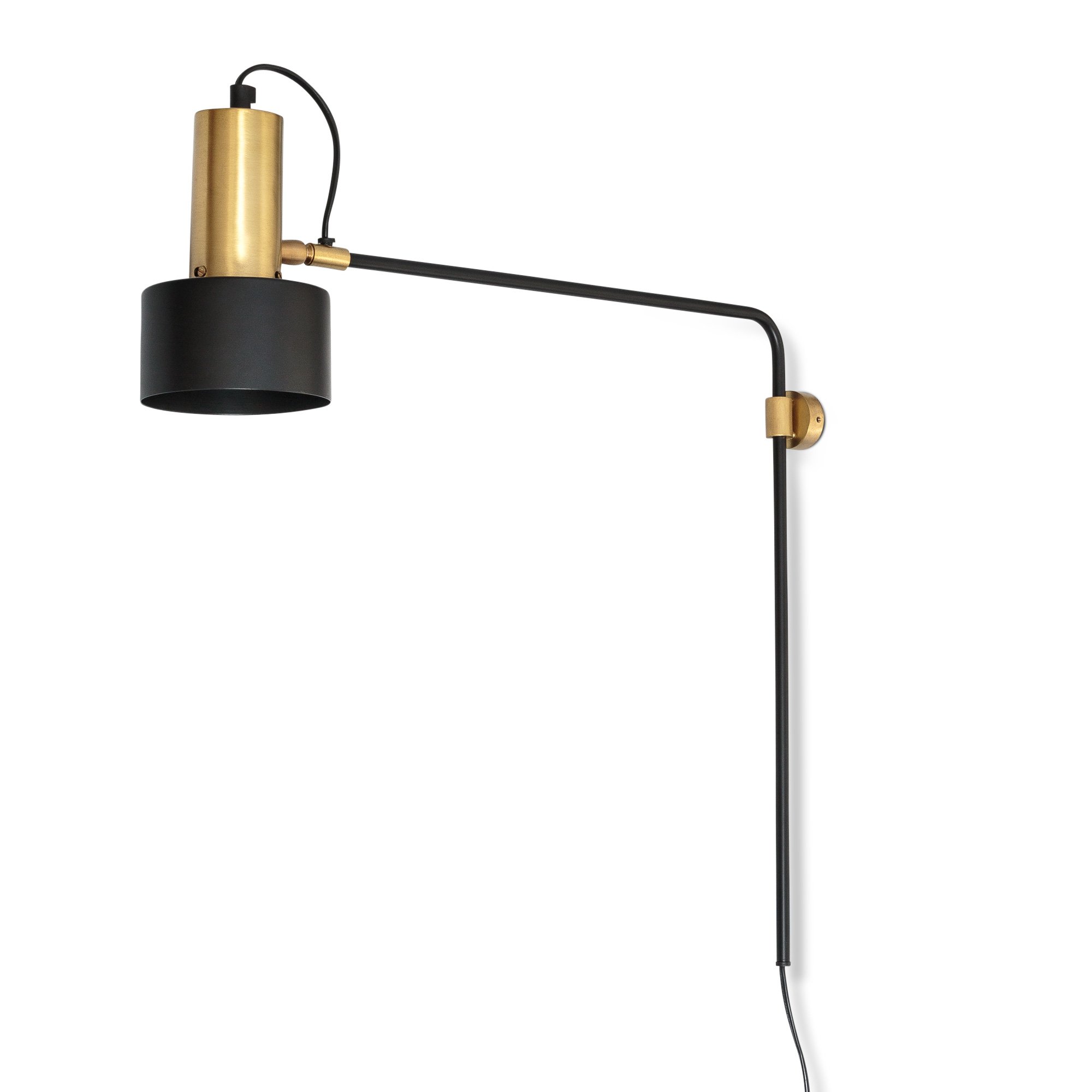 With a slim-line design and an understated finish, the Alba Wall Light captures the trend for directional lighting (bulb not included). Fitting into a chic industrial scheme, a black angular frame holds a drop-down shade and bulb with a gold stem, creating a spotlight effect.