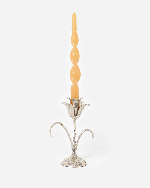 Three distinct glassware styles include a classic tumbler, a delicate striped coupe and an organic-shaped wine goblet inspired by a vintage glass Hannah’s father once owned. Pulling it all together and setting an elegant foundation for the tableware is an intricate hand-crocheted tablecloth. ‘Paired with the silver metal candleholders and delicately twisted candlesticks, it really elevates the look,’ says Kate Salmon.