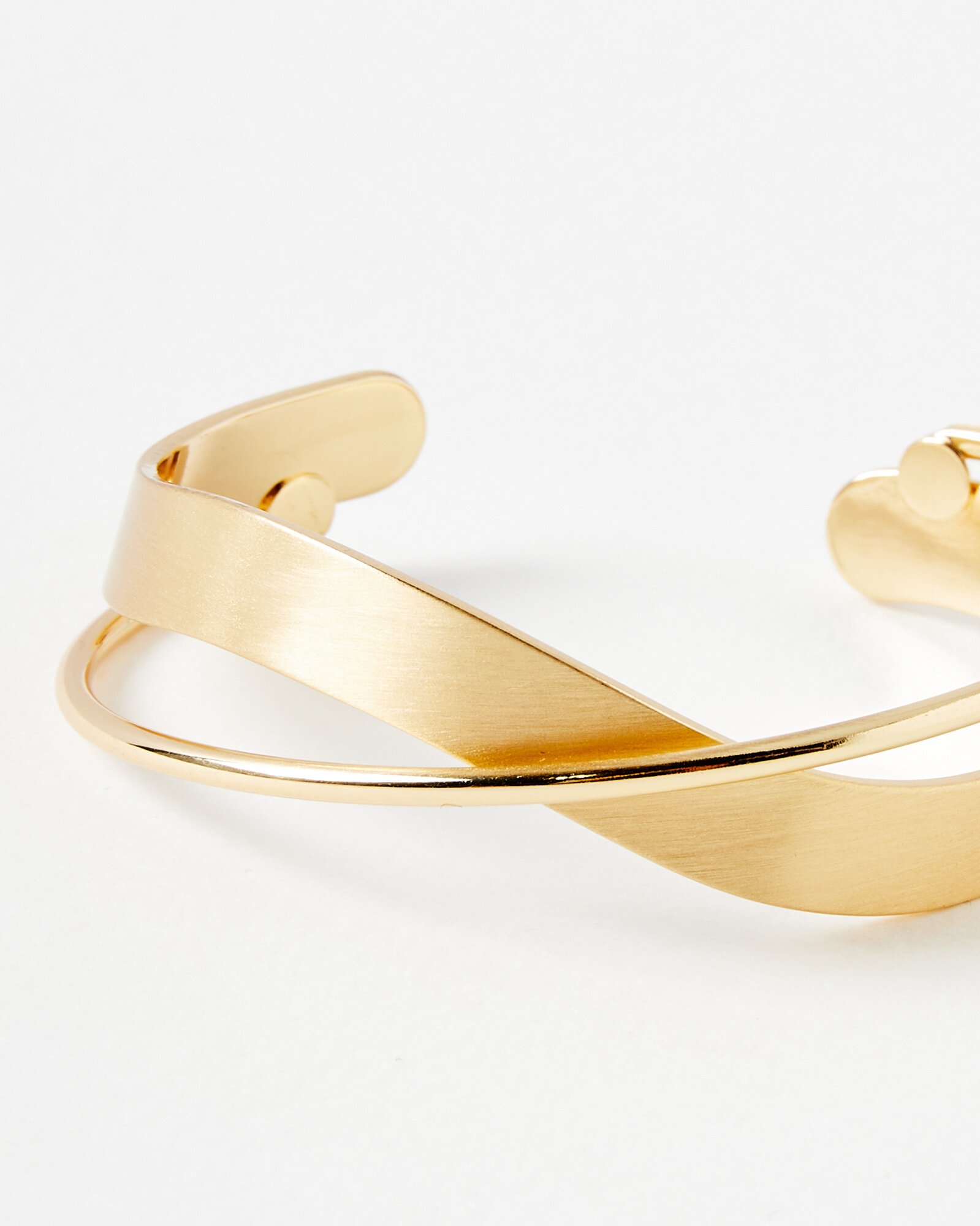 This gold toned cuff bangle features two overlapping panels, the upper a thin wire band and the lower a matte, flattened band with a subtle wave structure.
