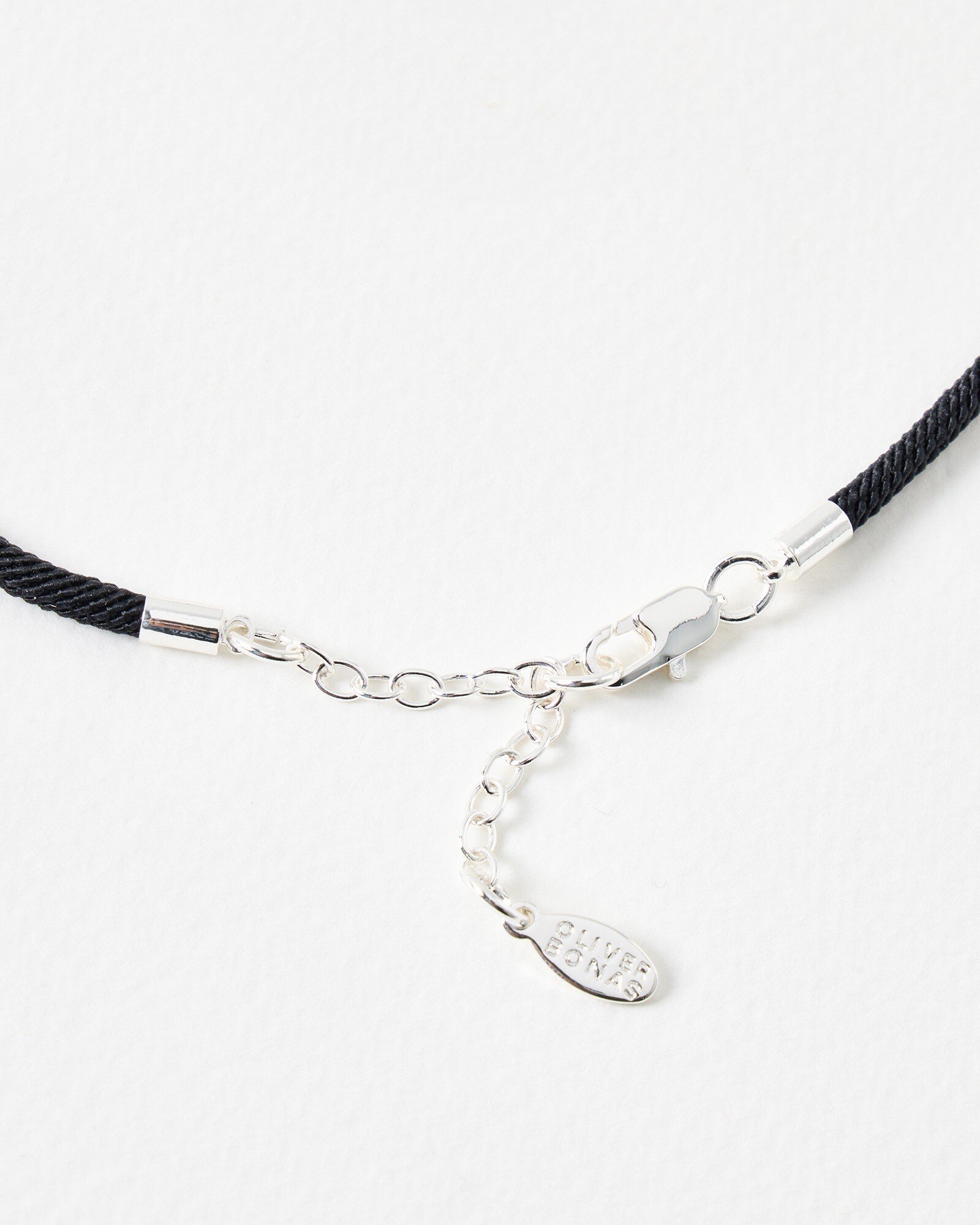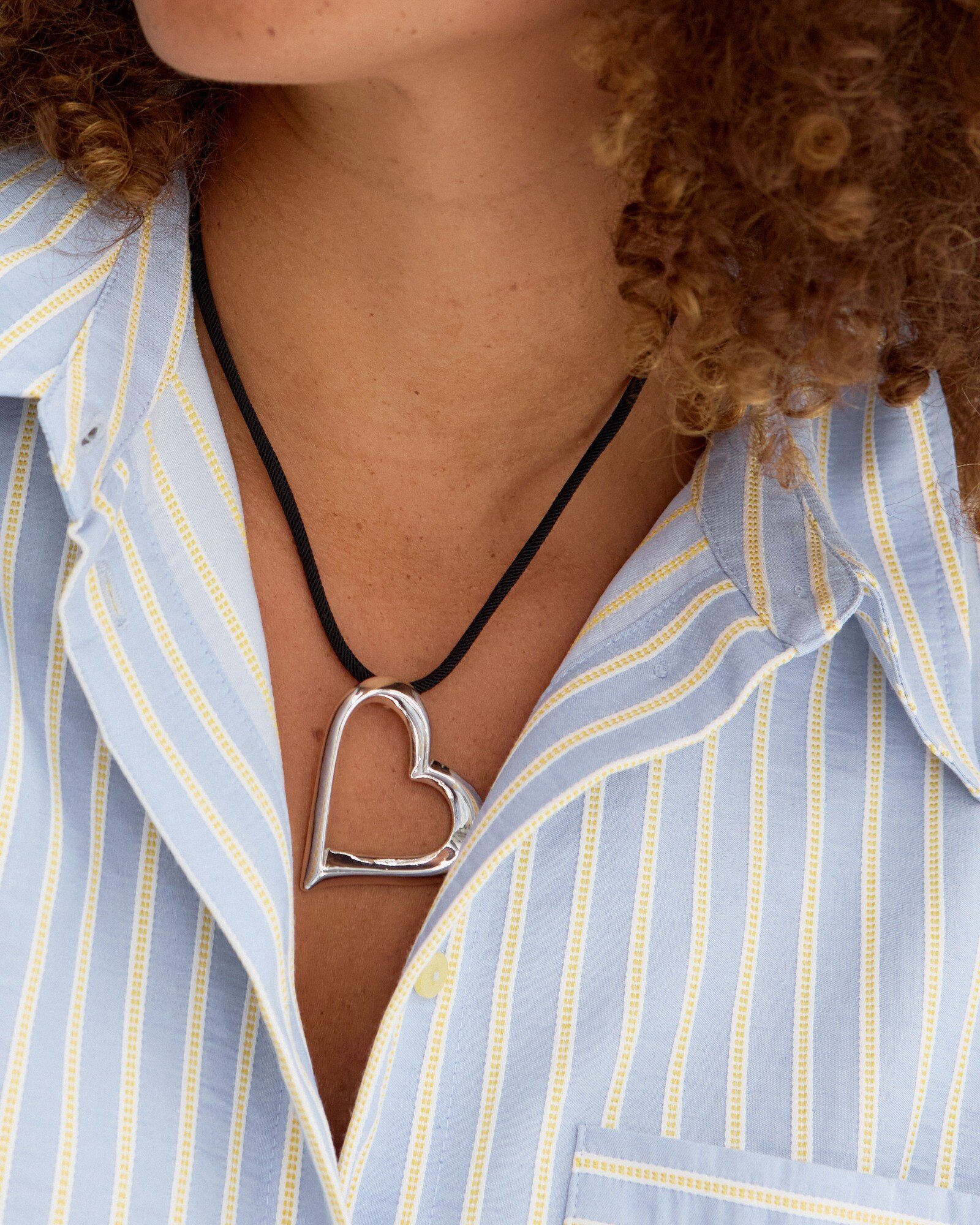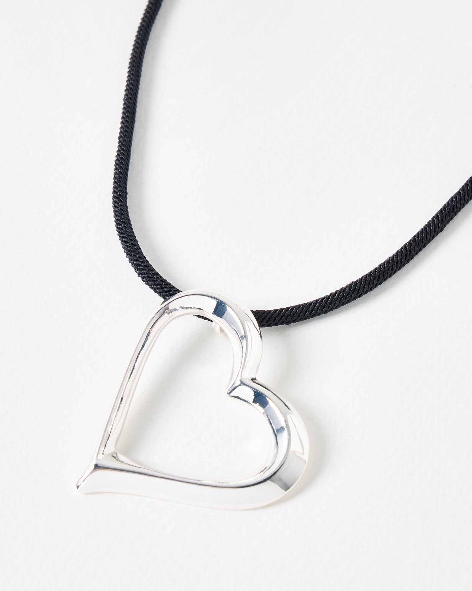 Statement heart necklace featuring a large silver tone heart charm strung on a black cotton cord, finished with silver hardware and an adjustable closure at the neck. For a bold, stand out look, style this heart necklace at the collar and layer with other silver necklaces for a textural finish. For events and partywear, pair with the matching Ariadne Heart Earrings for a matching set.