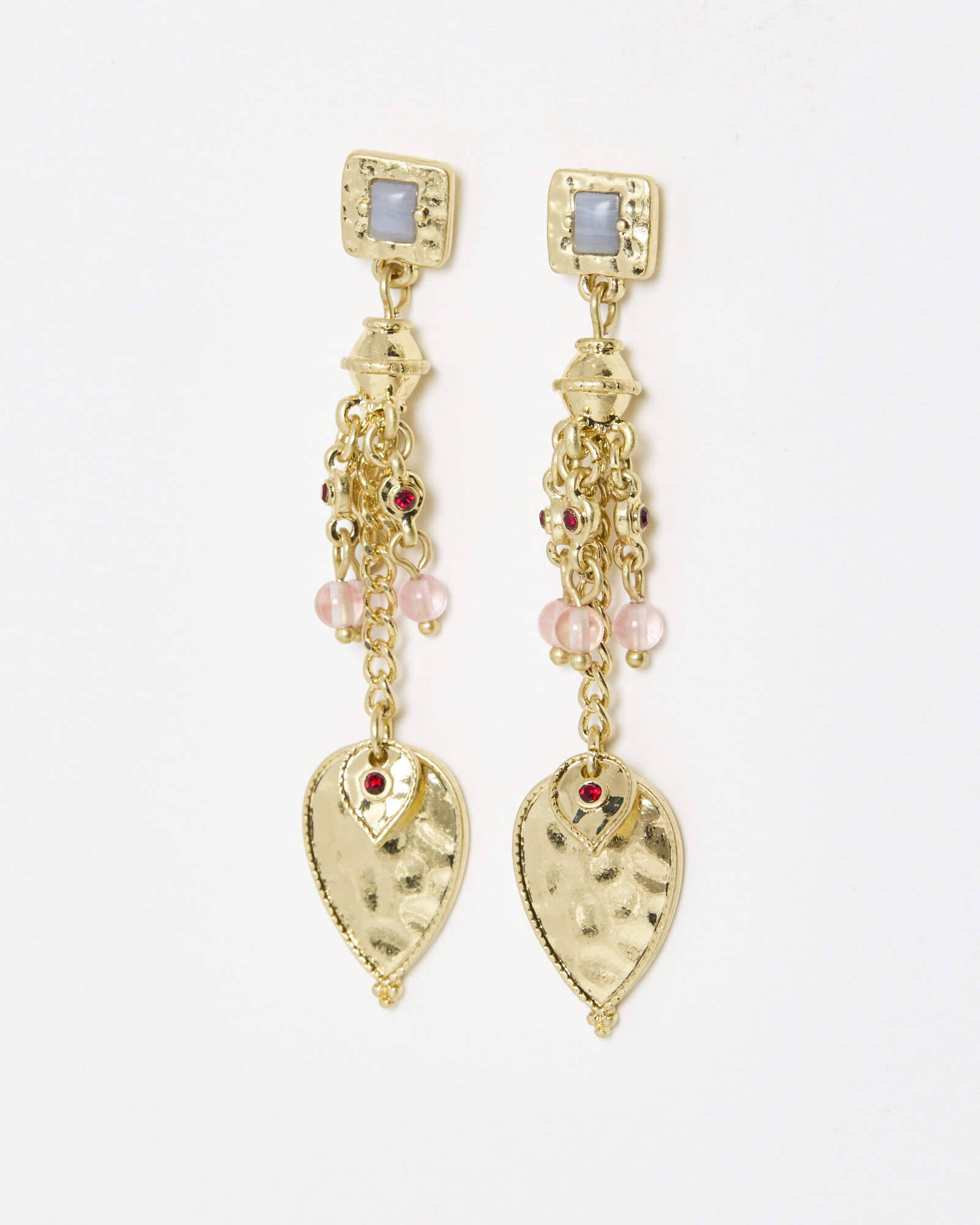 Gold tone drop earrings with a hammered leaf pendant, chain cluster and coloured stone charms.