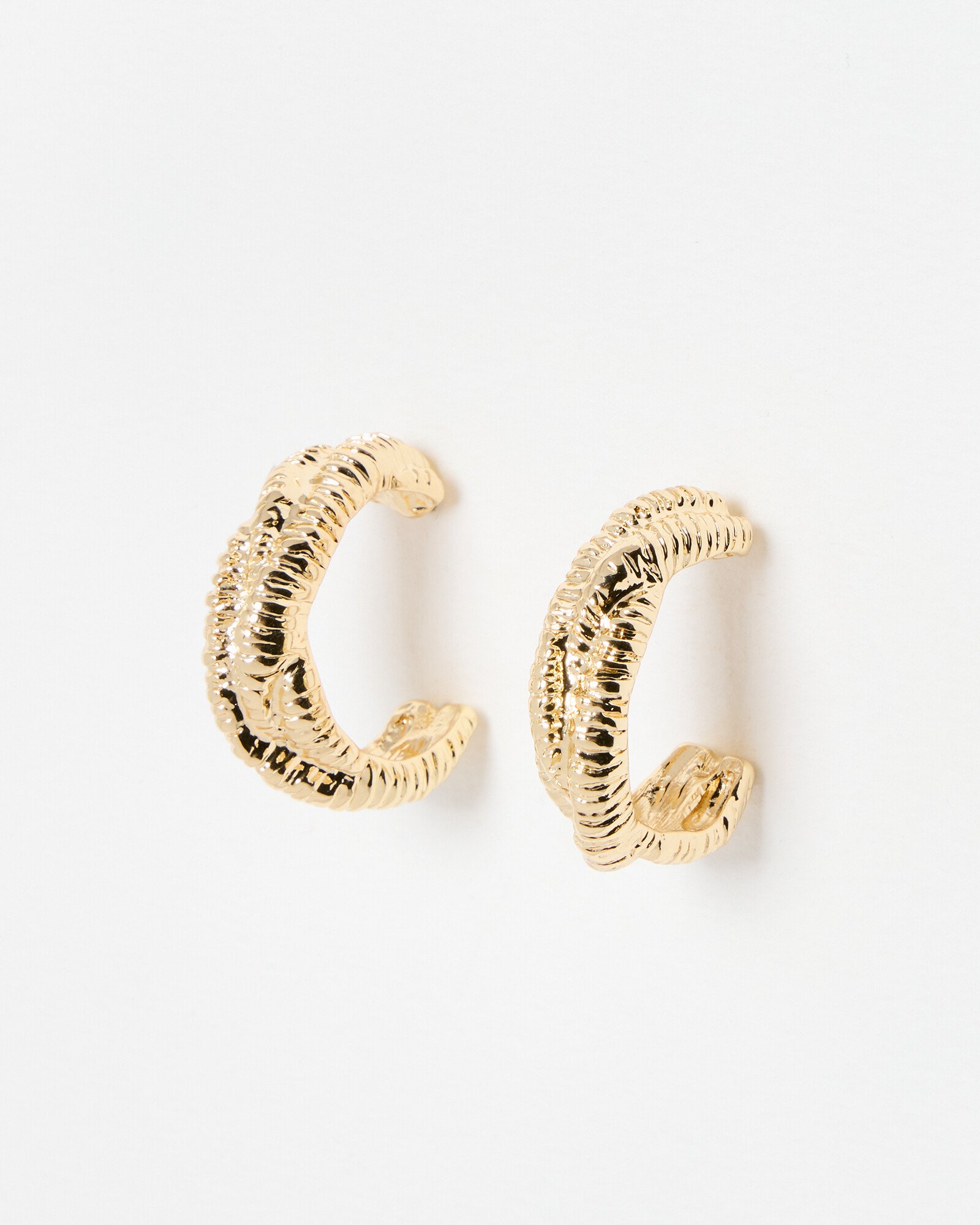 Chunky gold toned hoop earrings with a ridged texture and twisted, sculptural shape.