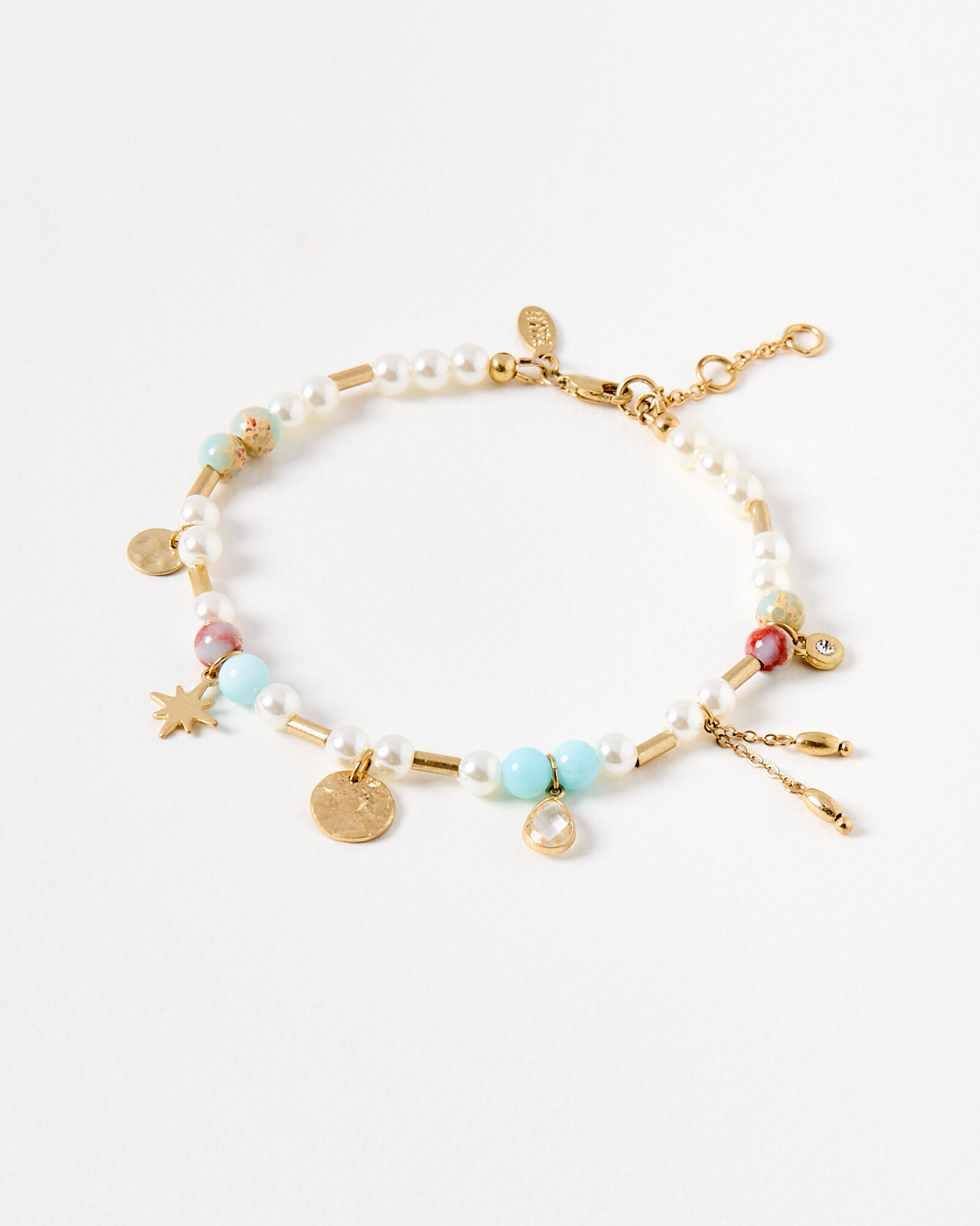 Beaded anklet with golden charms, coloured stones and faux pearls.