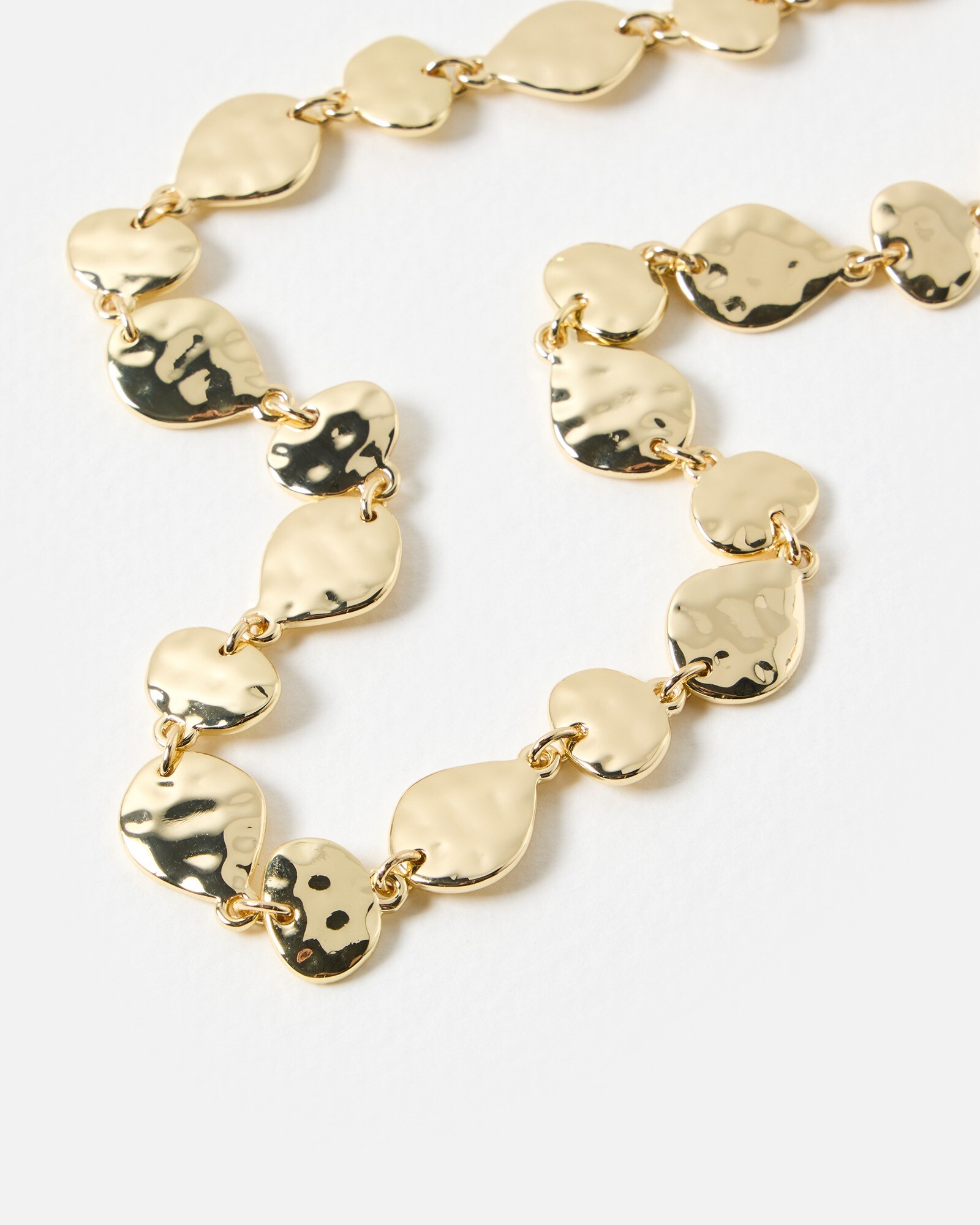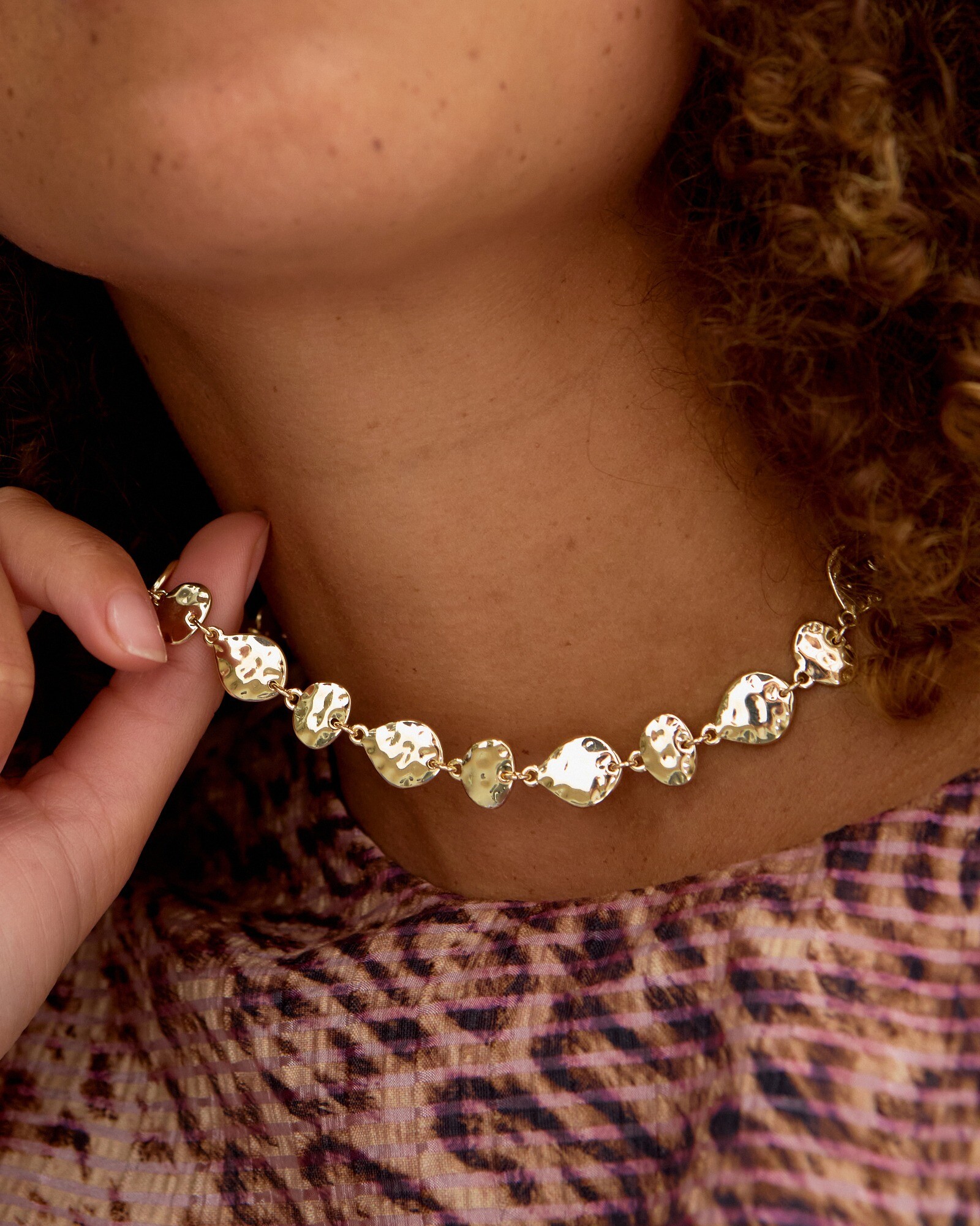 Catch the light with this high-shine collar necklace, made from multiple hammered discs in a gold tone metal with an adjustable closure. This gold collar necklace would make an elegant statement worn with wedding guest outfits, summer dresses, and smart blouses, effortlessly adding a textural finish to your outfit. Style with other gold jewellery pieces to complete the look.