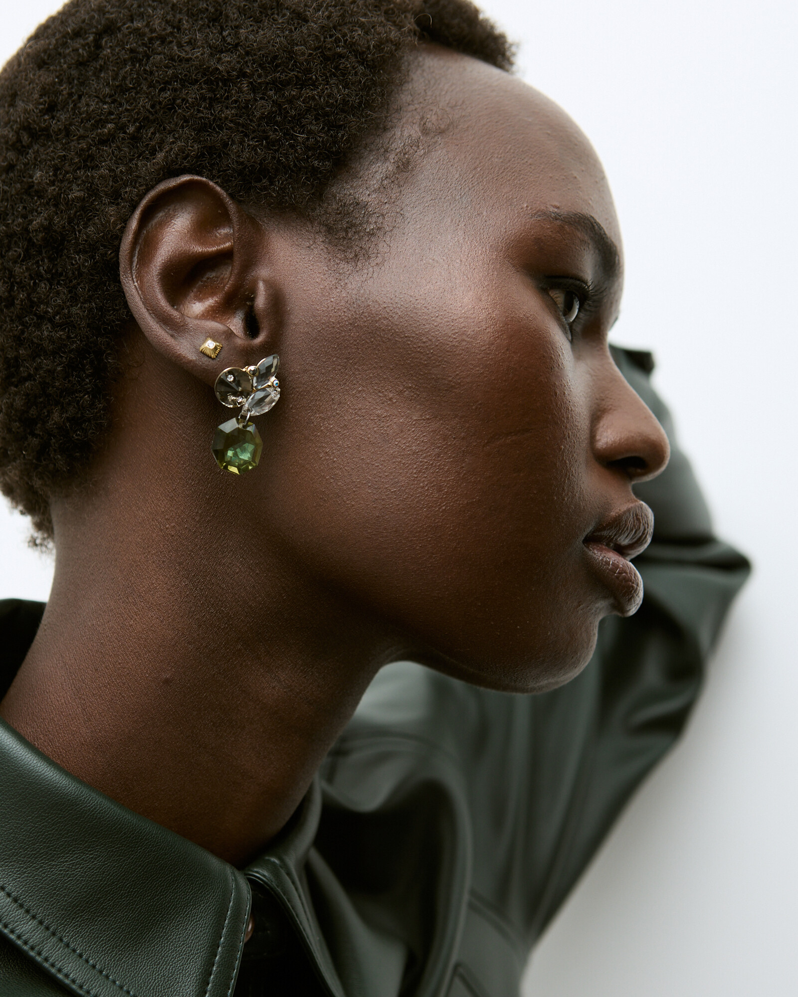 Gold-toned drop earrings with a cluster of tonal green stones.