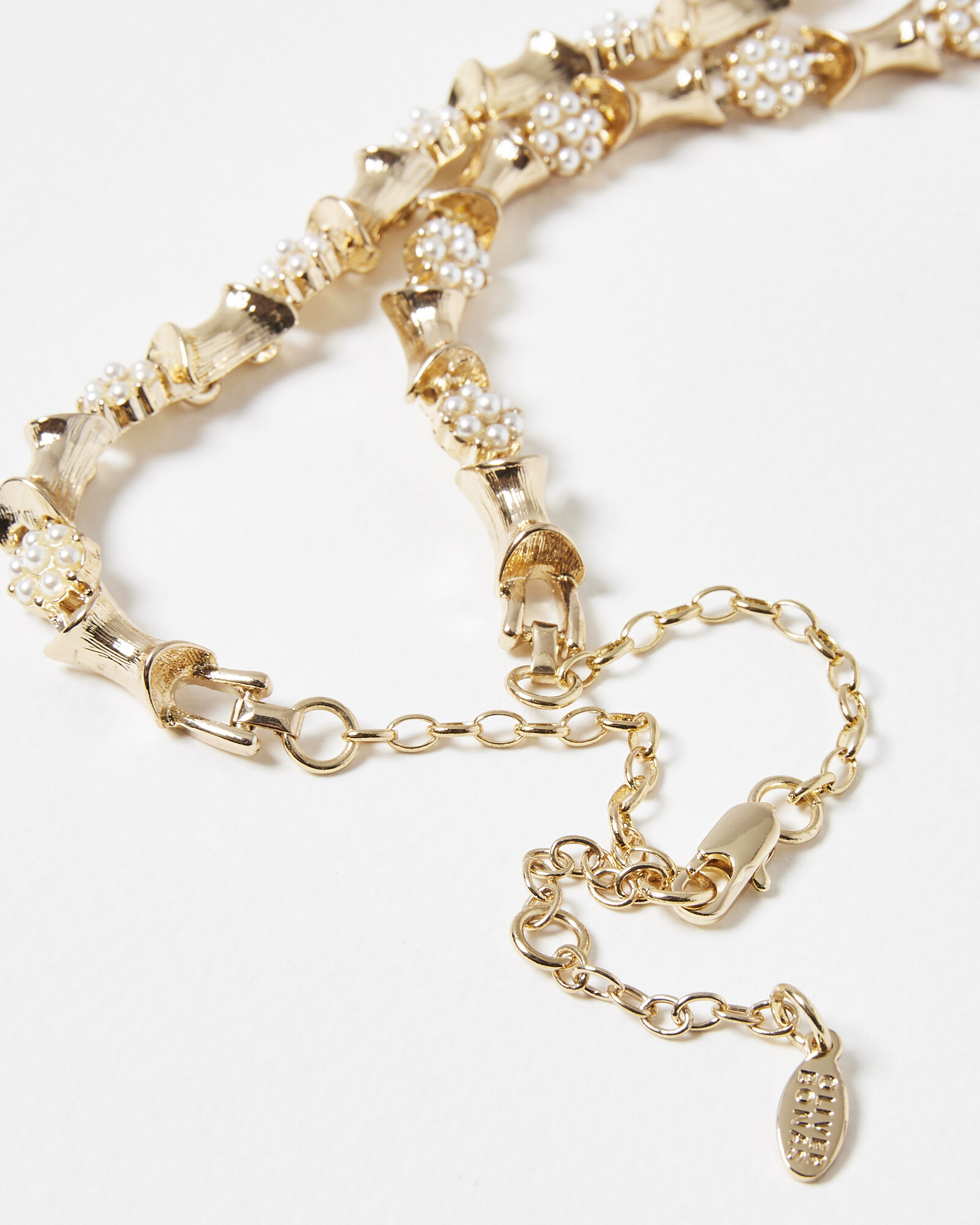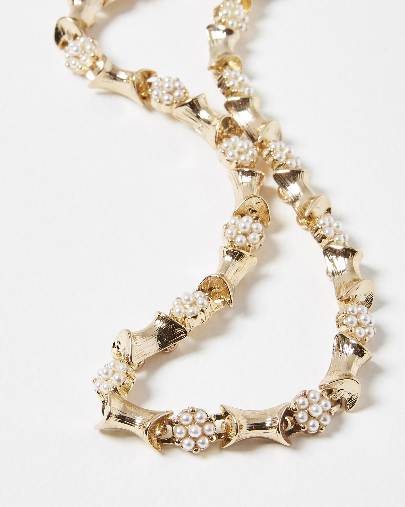 Chunky short necklace made from curved golden links and clusters of faux pearls.