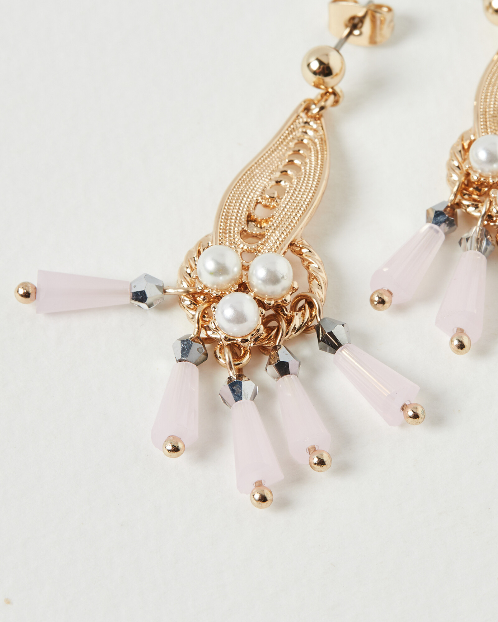 Pink gems combine with small faux pearls in these golden drop earrings, with an engraved teardrop pendant and twisted ring.