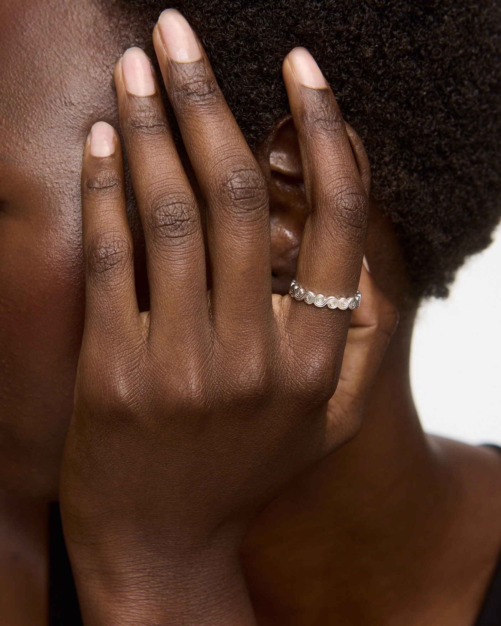 Slim sterling silver ring featuring an engraved spiral detail all the way around the band and a high shine finish. This silver stacking ring is perfect for stacking with other silver rings, or pairing with the matching Clodagh Swirl Bangle and Earrings for textural summer styling.