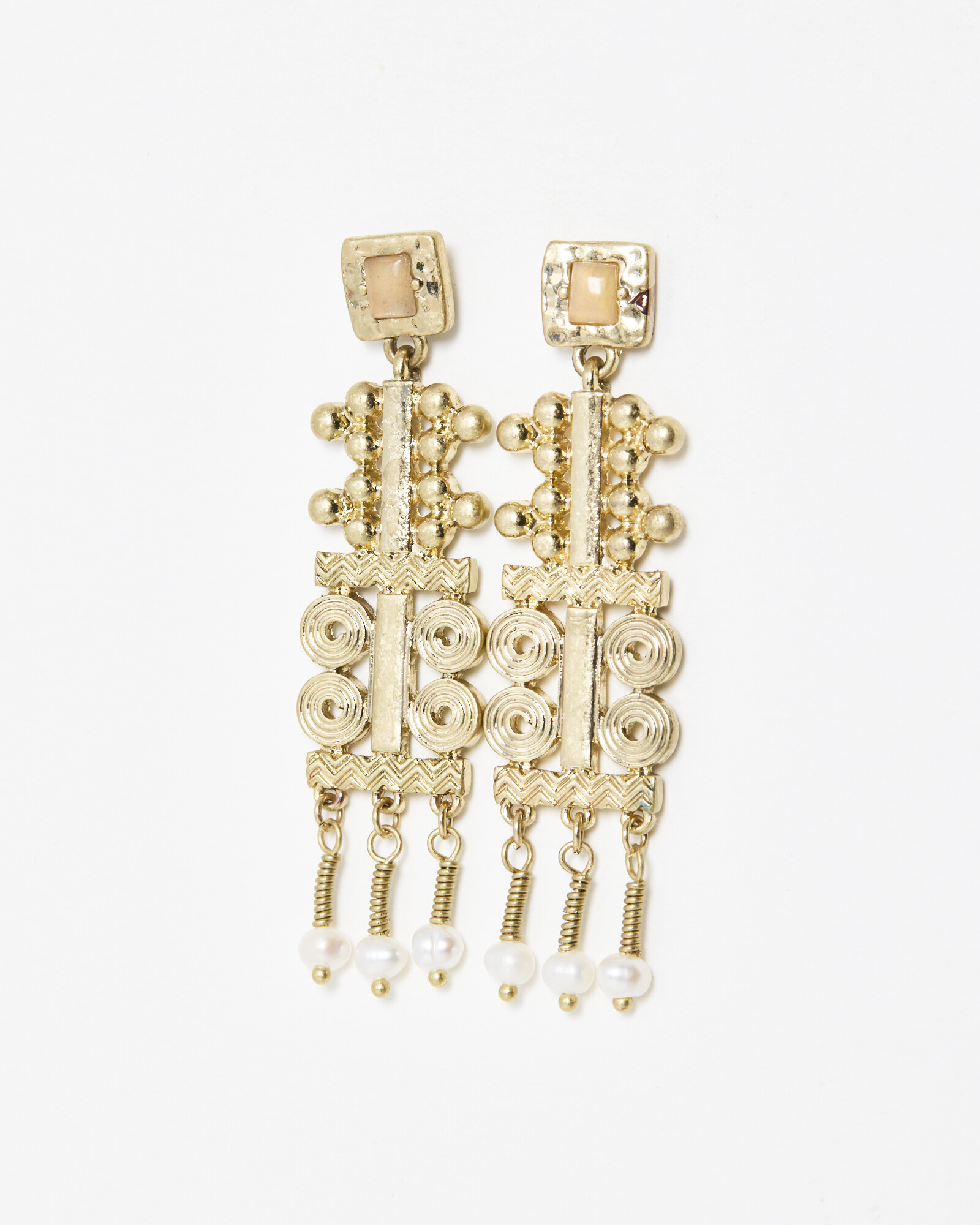 Golden drop earrings with engraved spiral discs, stone-embellished stud and small faux pearl tassels.
