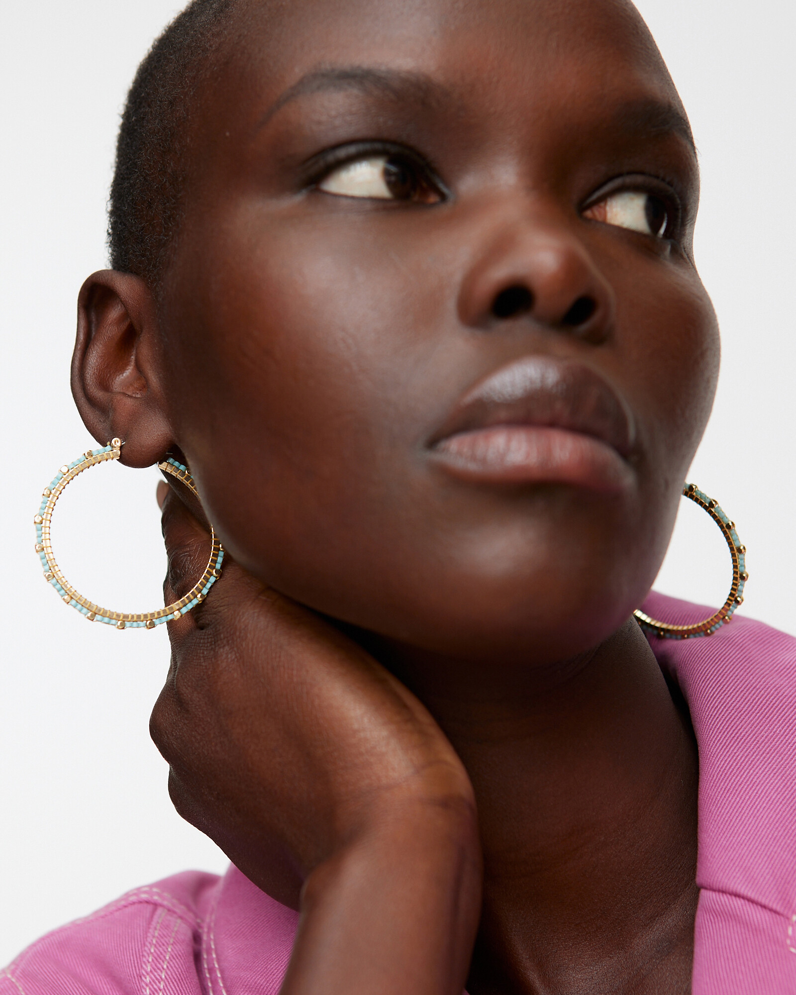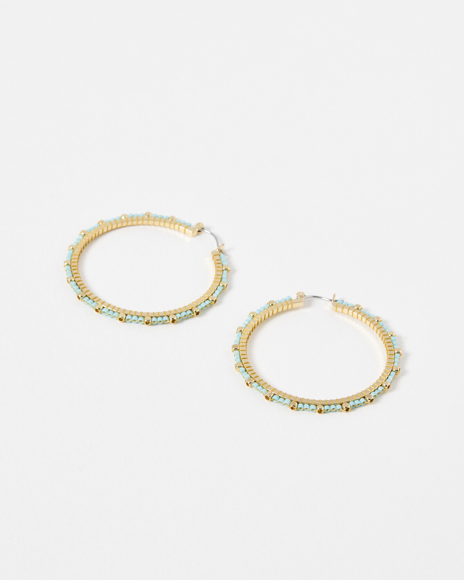 Golden hoop earrings with small blue beads threaded around the slim hoop.