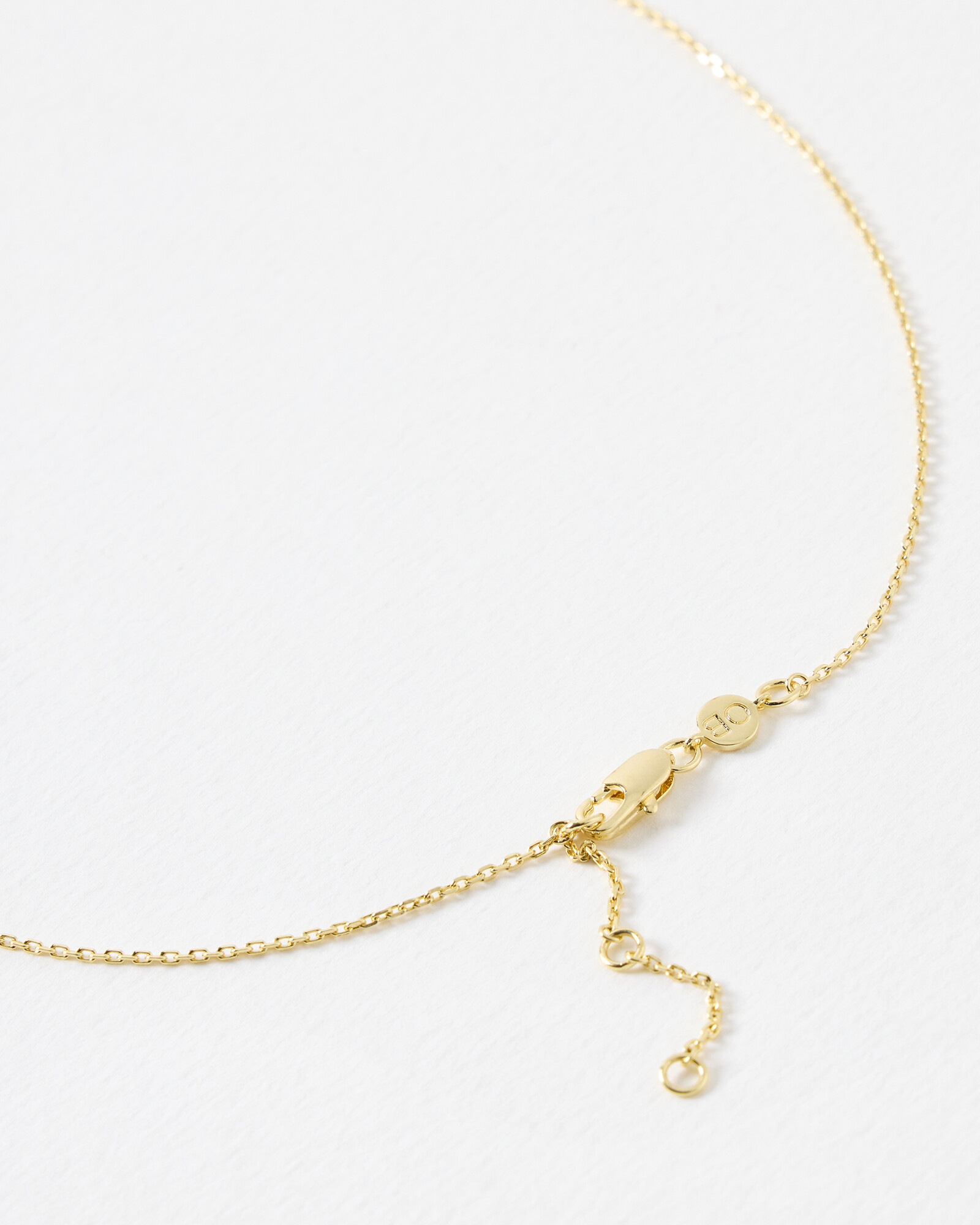 Our gold jewellery is coated in approximately one micron of 10-carat gold plate on a brass base. We use gold plating to keep our pieces both high quality and affordable, for long-term wear. For more information about the materials we use in our jewellery, read our jewellery material guide.