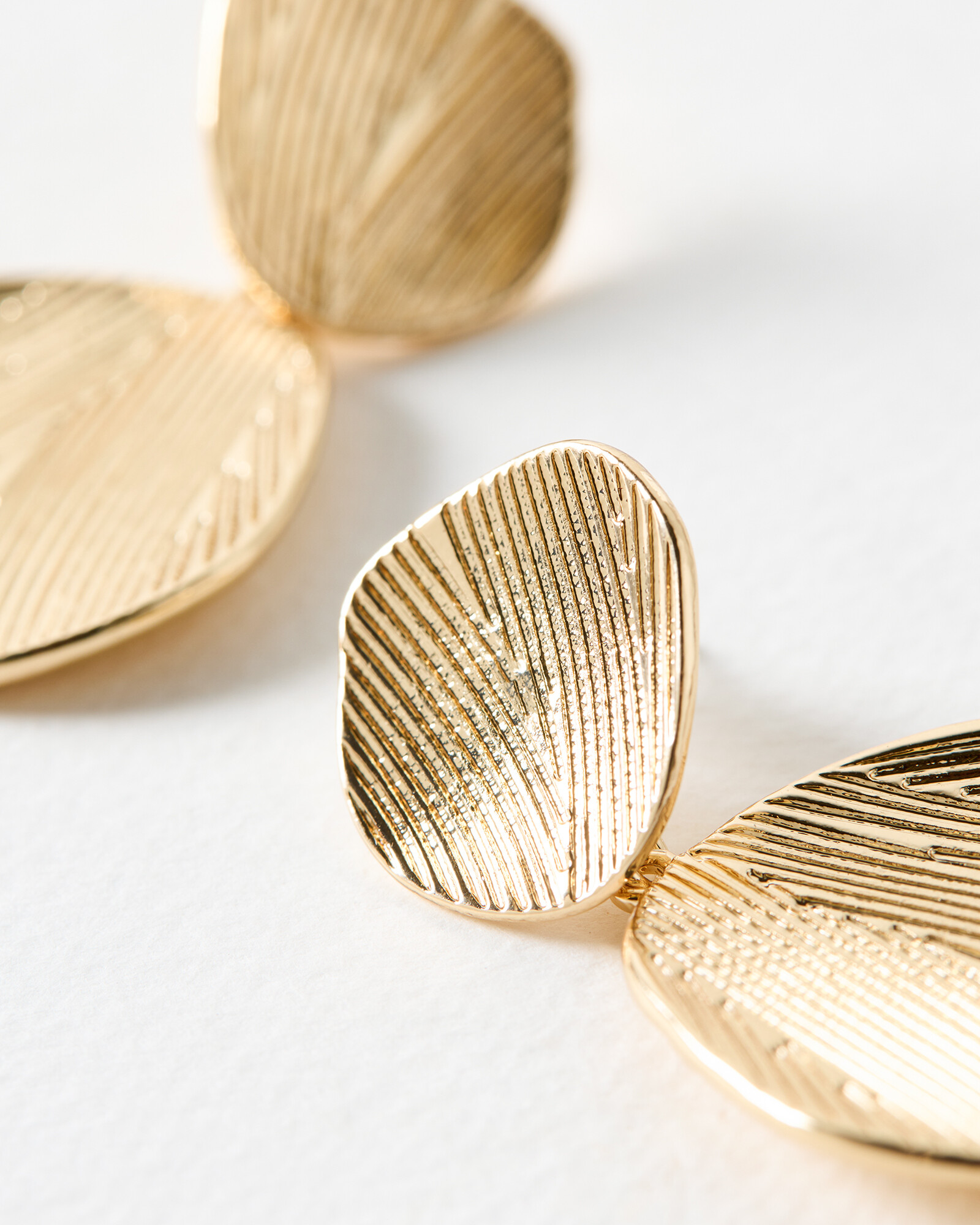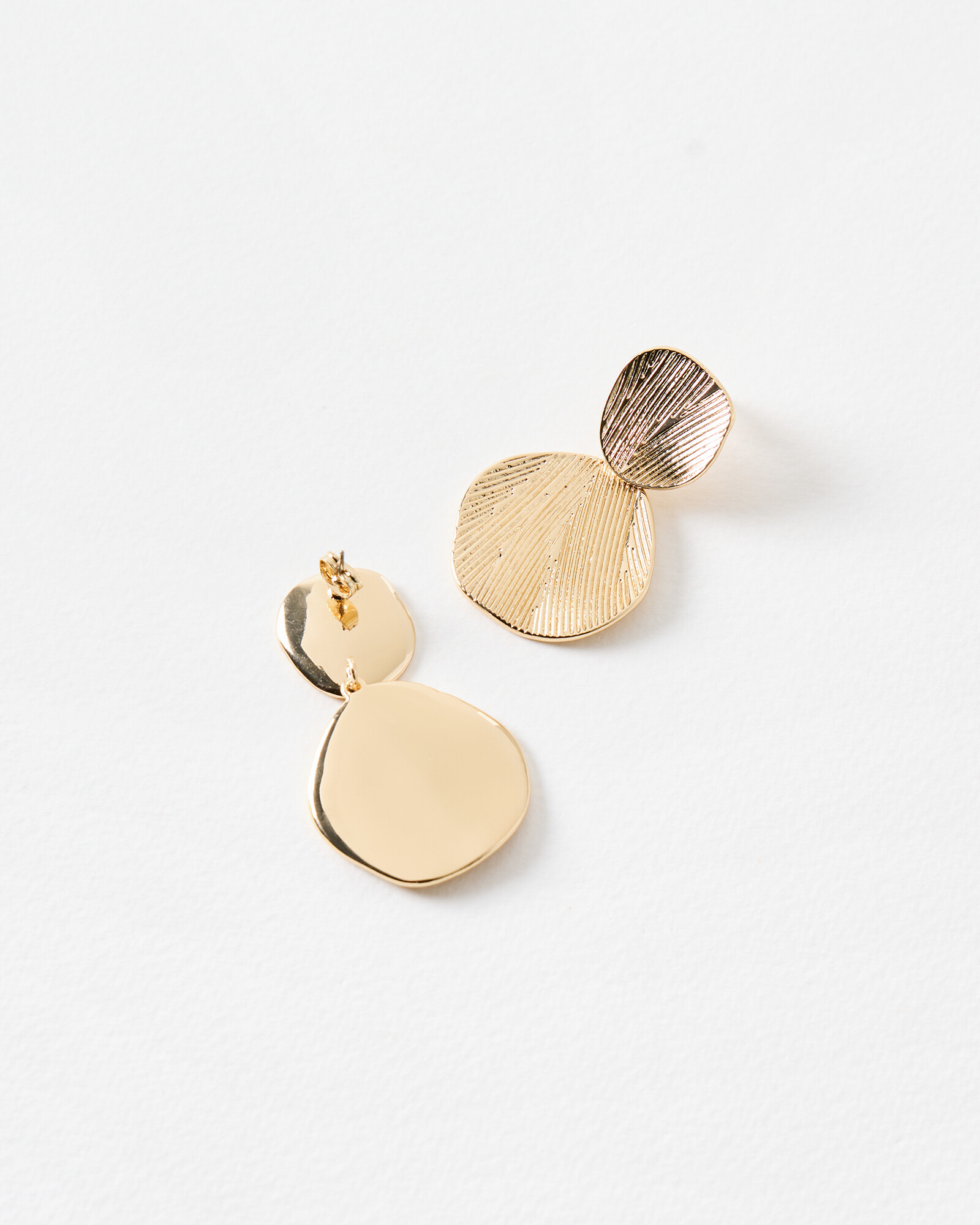 Gold toned statement earrings with a two-tiered drop, consisting of two large discs with lightly textured surfaces. Dropping beneath the lobes in a bold design, they feature stud backs for secure and easy wear. Pair with the Ester twisted cord necklace to complete the set, of style as statement earrings with your favourite party looks.