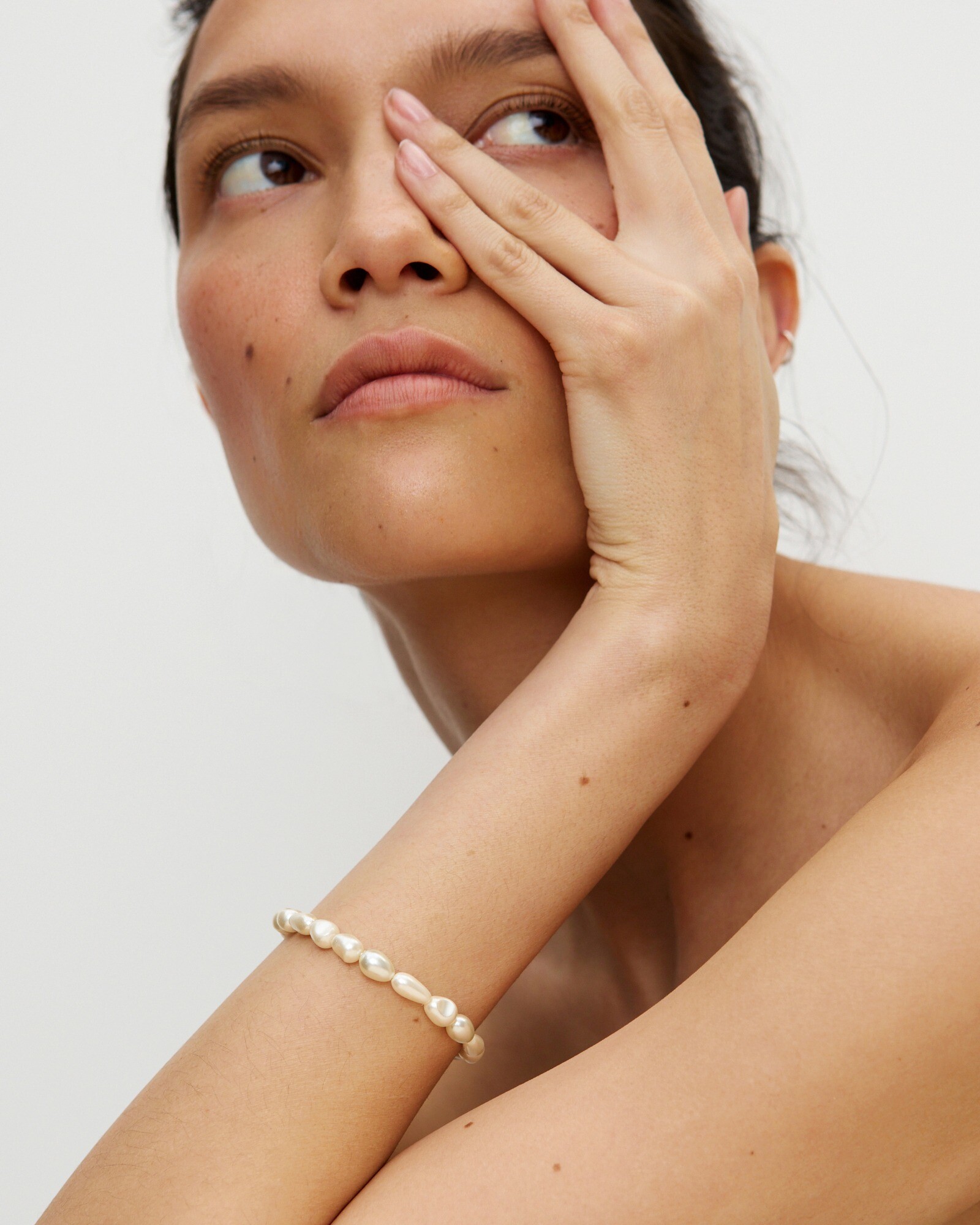Faux pearl chain bracelet featuring multiple, organic shaped faux pearl beads, and and adjustable lobster clasp closure with three length alternatives. Style with matching pearl jewellery pieces for an elegant style, prefect for summer wedding outfits, and holiday layering.