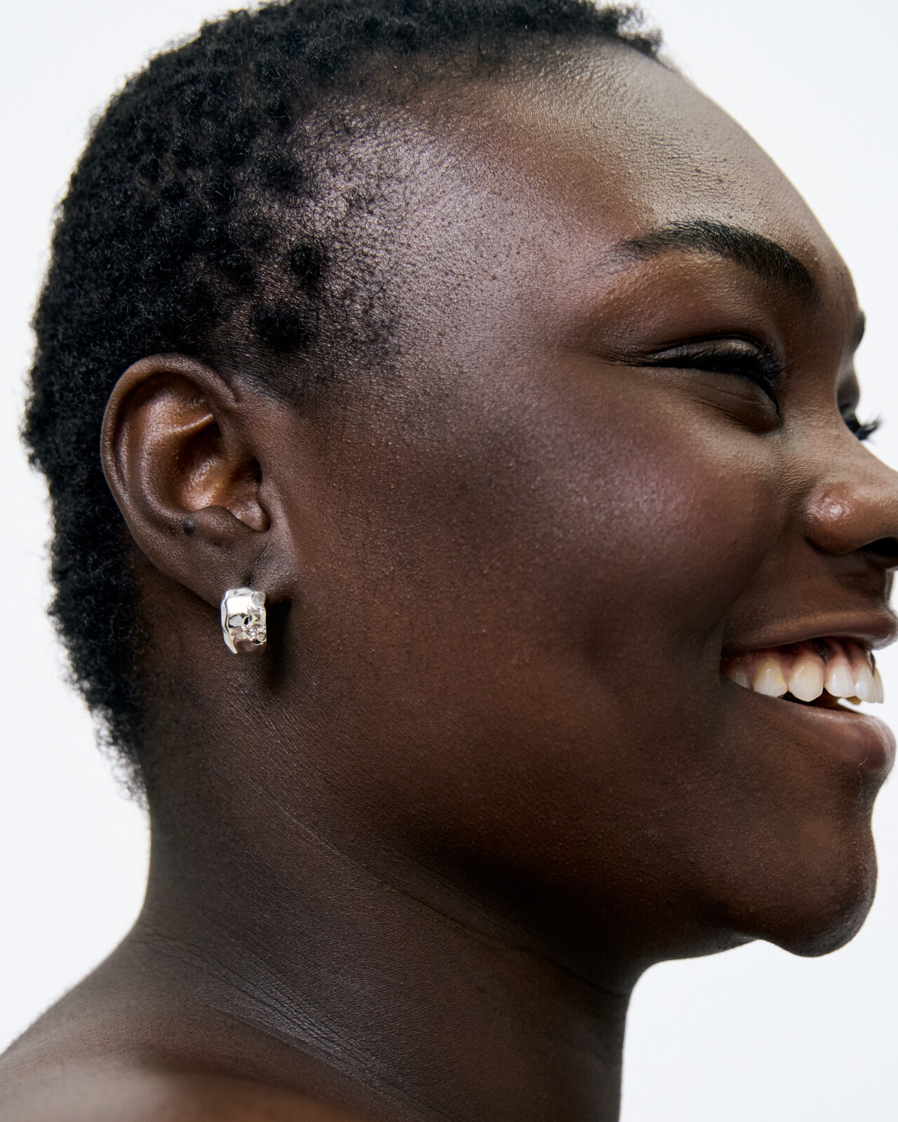 Chunky faux-hoop stud earrings in a silver toned metal, inlaid with a small cluster of clear stones and finished with a shiny, lightly hammered effect. Wear everyday to elevate your look, or style with your favourite party outfits for extra shine.