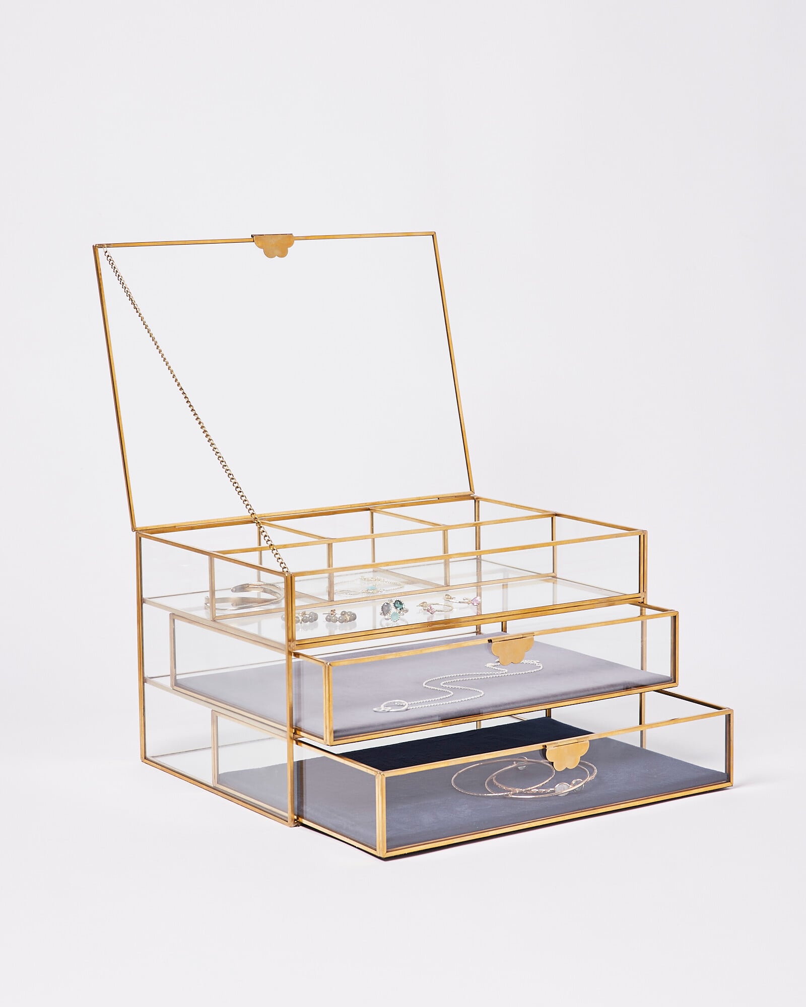Gold & Glass Blue Velvet Three Tier Jewellery Box