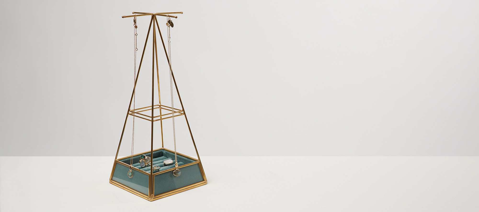 For space-saving jewellery storage, opt for the Gold & Glass Pyramid Blue Velvet Jewellery Holder, lined in plush, duckegg blue velvet. With four bars at the top to hang necklaces and bracelets from, this pyramid-shaped holder also has two bars at mid-height to hook earrings through and a cushioned compartments for ring storage.