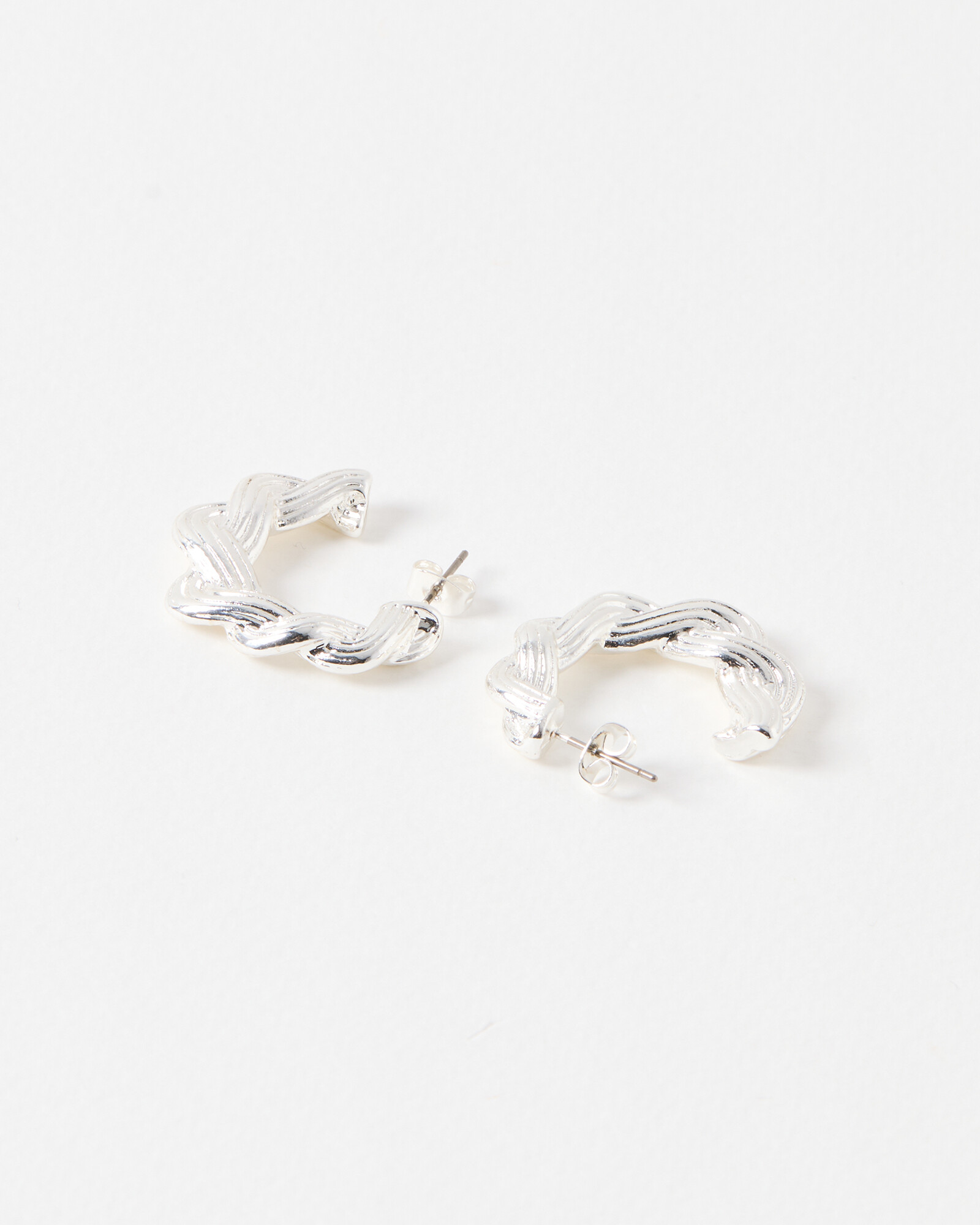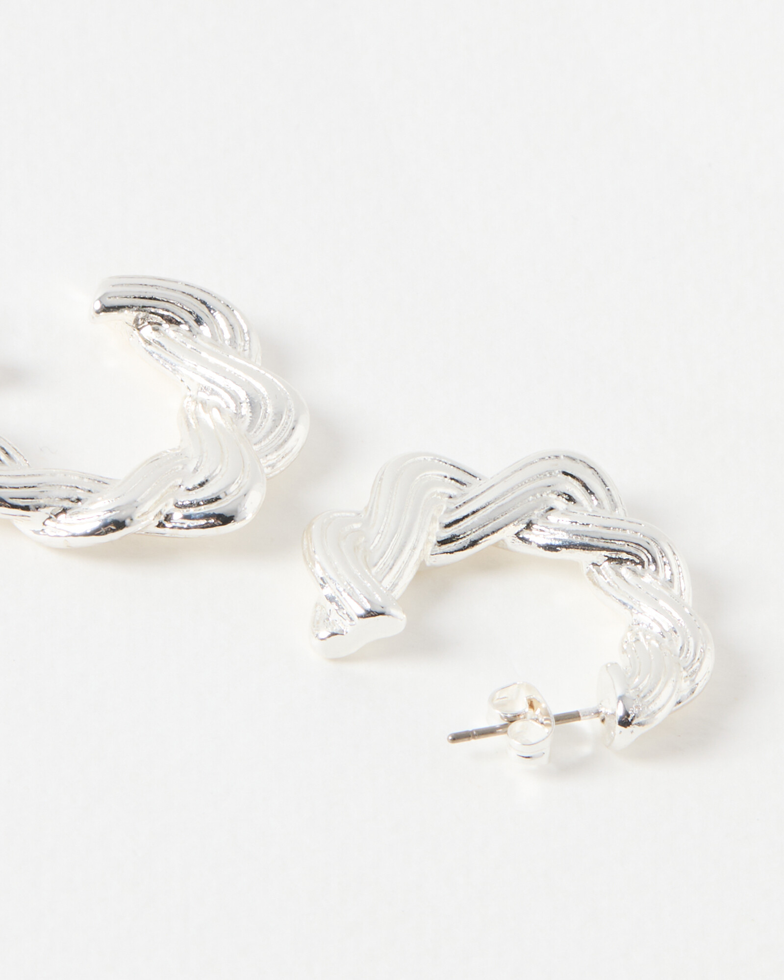 Large chunky twisted hoop earrings in a silver-toned metal, with a textured rope-like finish and stud earring back. Perfect for styling with party and occasion outfits, or wear everyday to elevate your look.