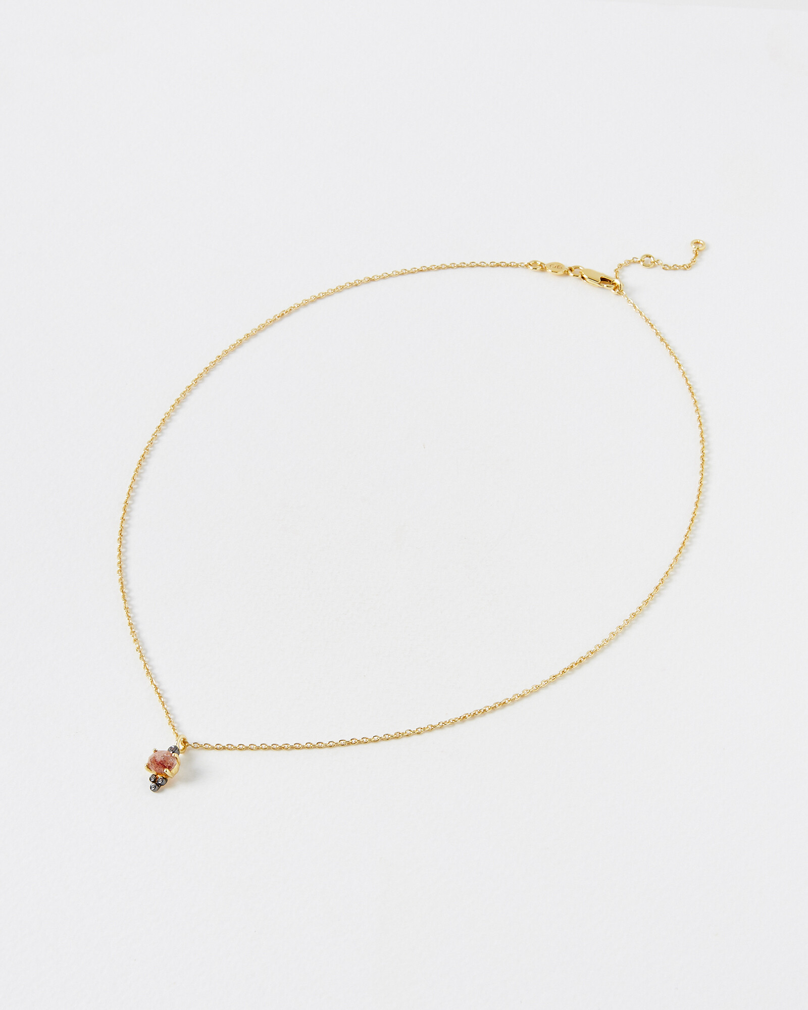 Gold plated pendant necklace with a slim chain and a oval strawberry quartz and grey ruthenium stone at the front.