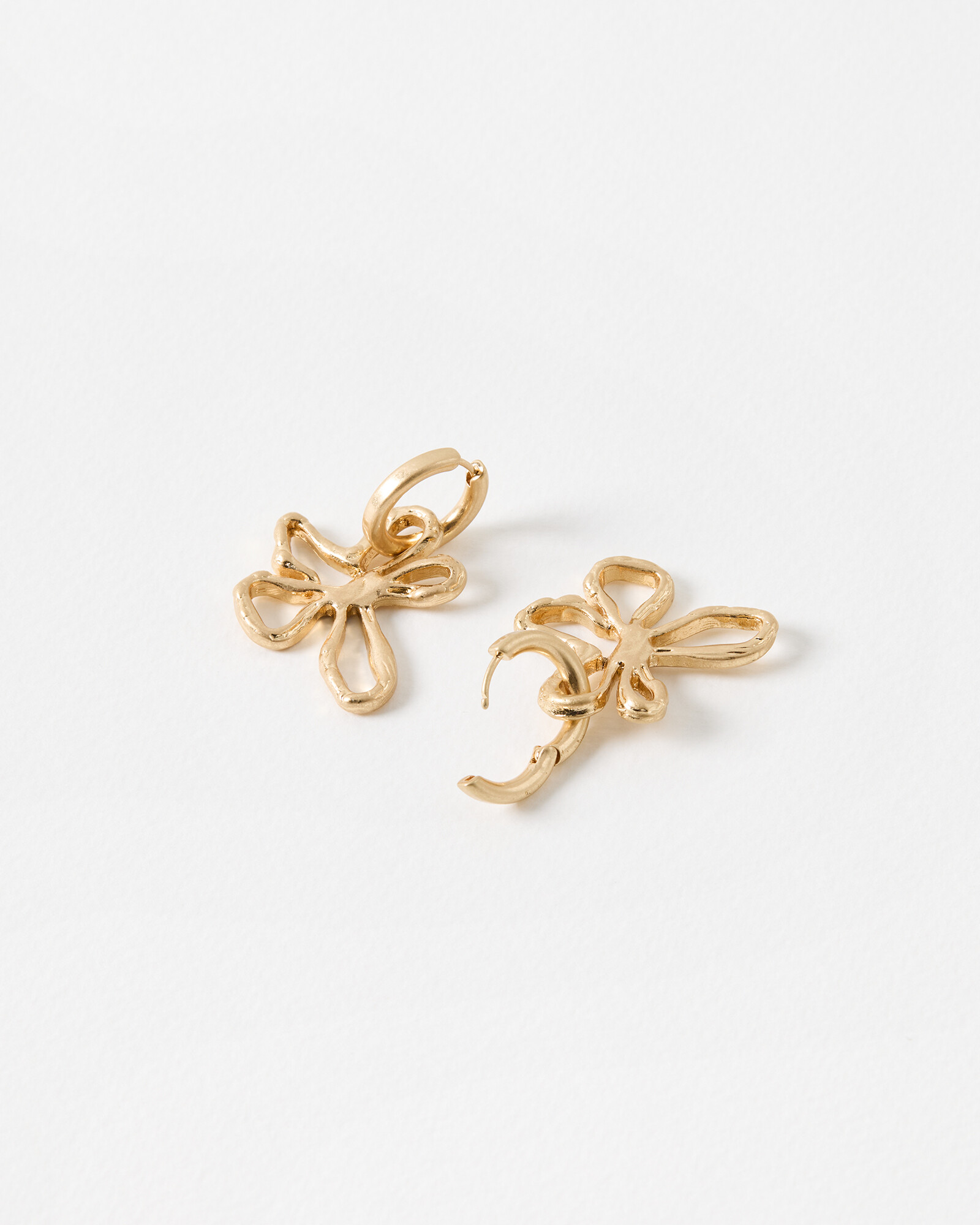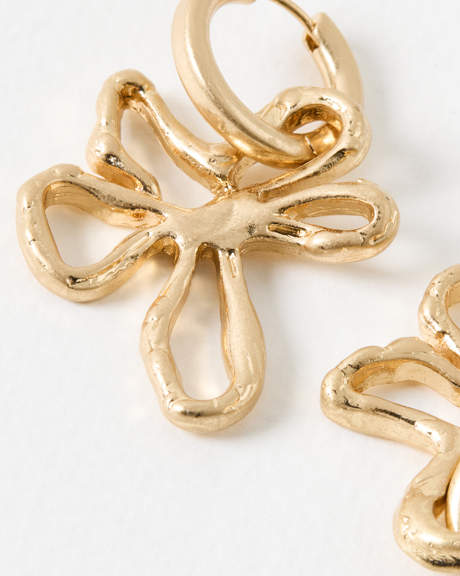 Medium sized gold tone hoop earrings with a clicker clasp closure, featuring a large brass flower charm in an organic, cutout profile. The hoop earrings loop through the petals of the flower charms, which can be removed if desired for mix and match styling. Pair with the Jackson Beaded Flower Necklace and a matching bracelet for a bold, summer holiday ready look.