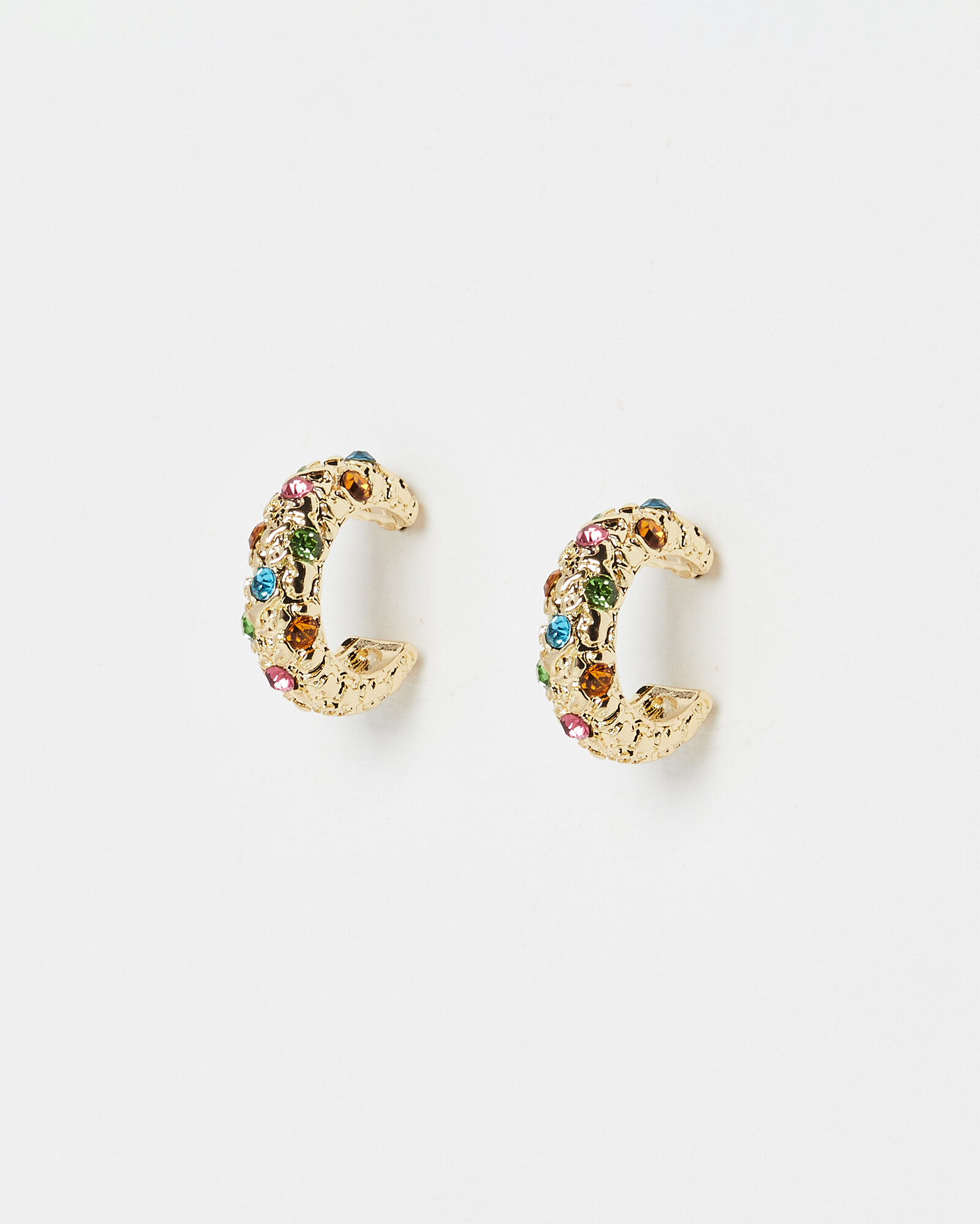 Golden hoop earrings with a wide, textured surface and multicoloured gem embellishments.