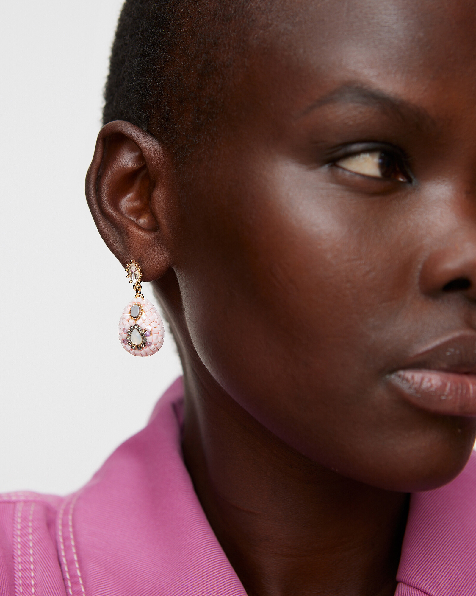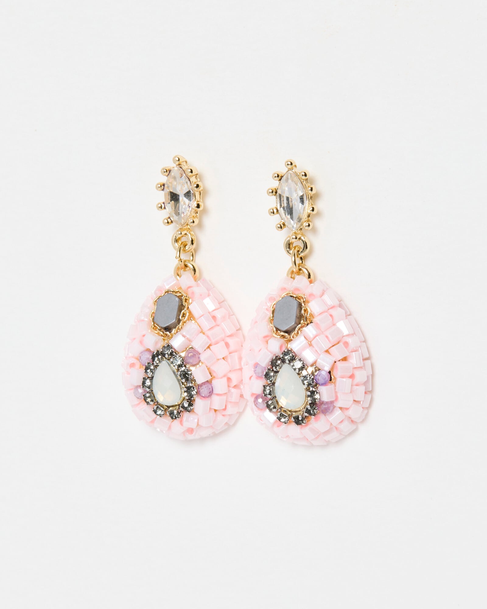 Gold-toned drop earrings with clear gems and a pink beaded teardrop charm.