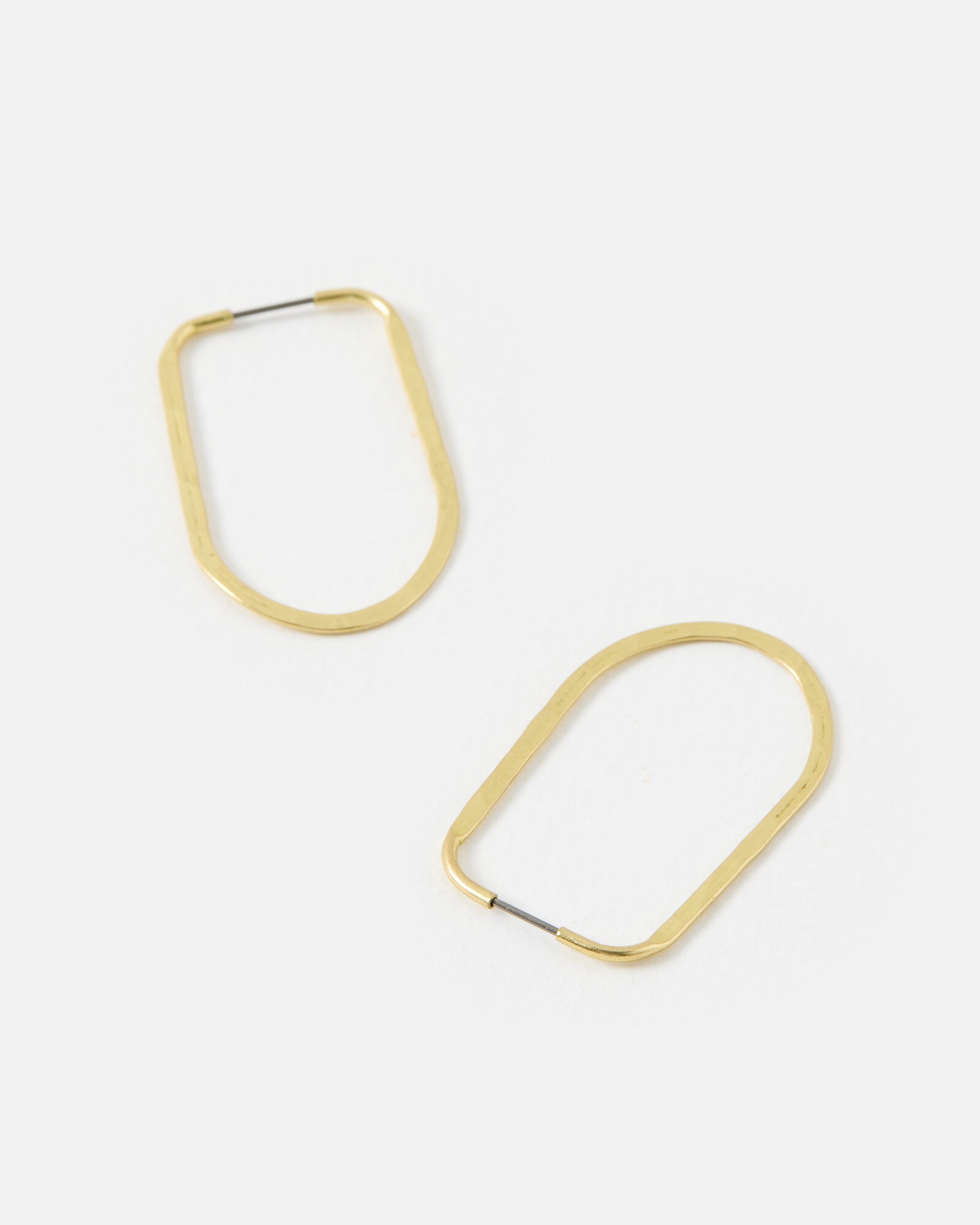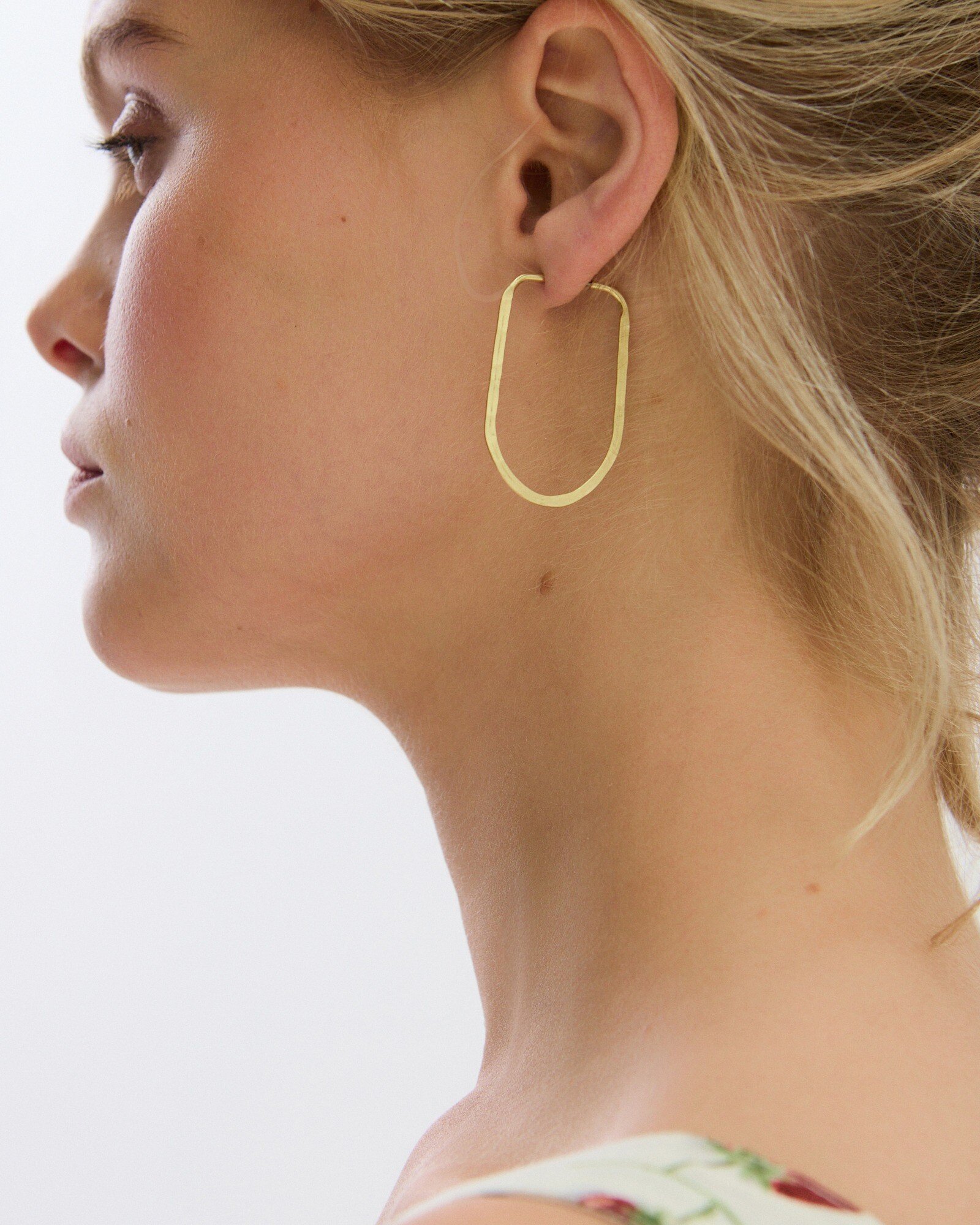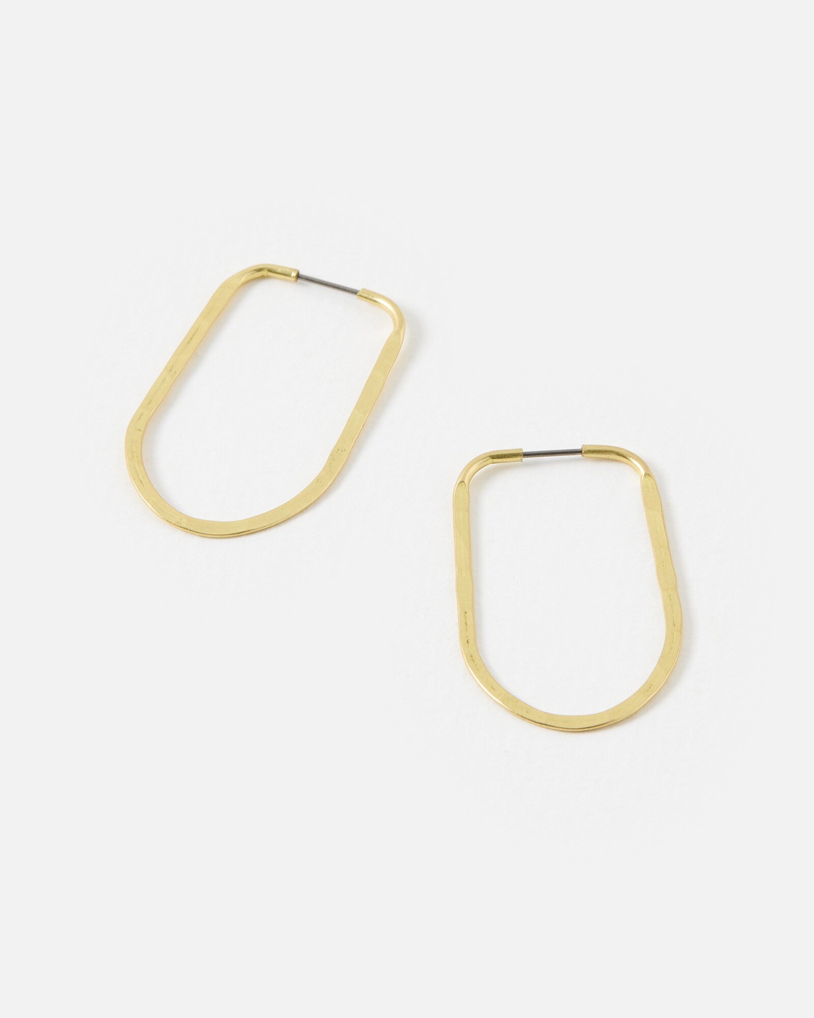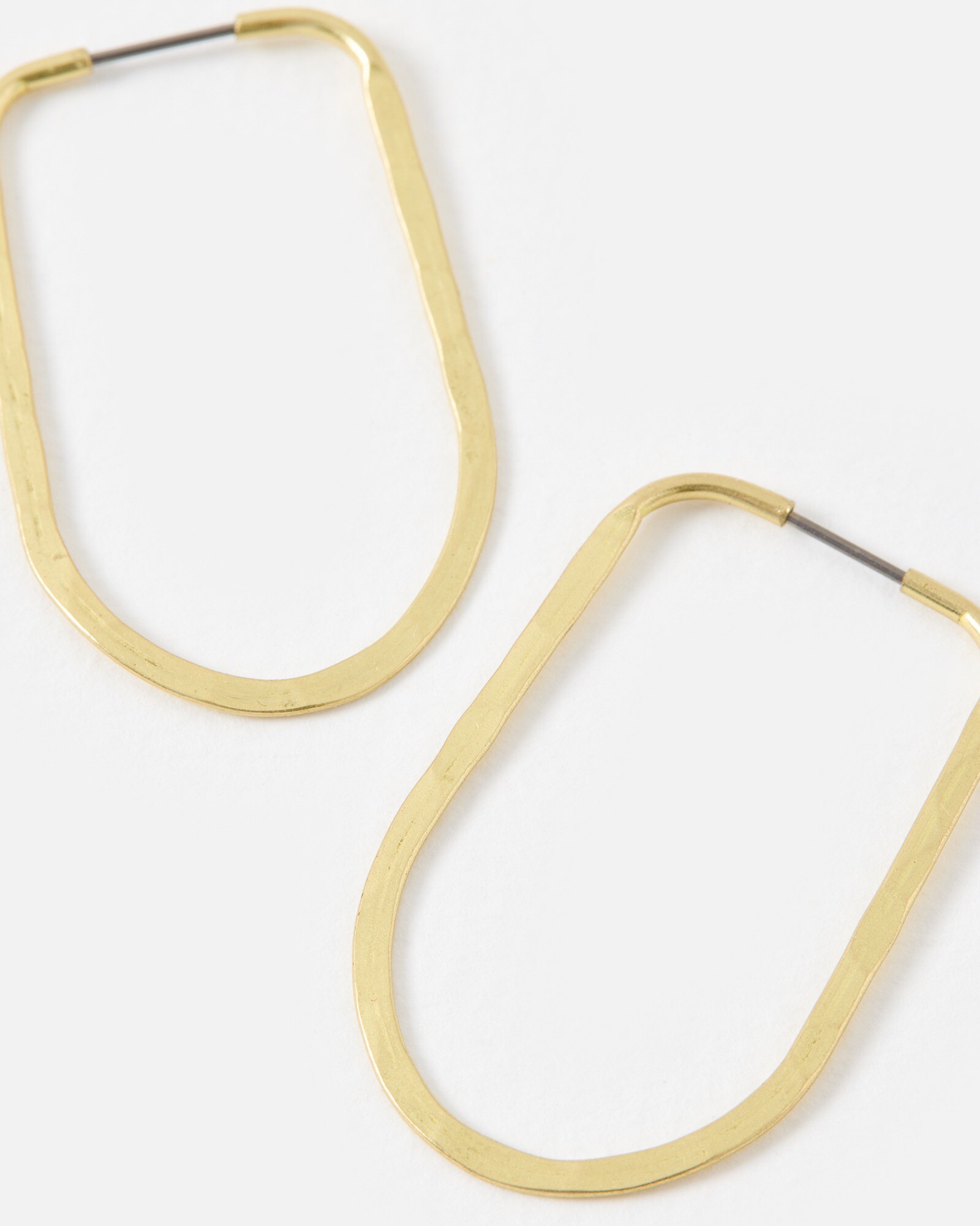 Long hoop earrings made from a hammered gold toned wire, featuring a flattened edge, smooth surface and shiny finish. Secured with a simple hoop closure, these gold statement earrings are a stand out piece for your summer jewellery collection, perfect for wearing to smart events and with occasion wear. Style alongside a chunky gold necklace and gold rings for a classy, sophisticated look.