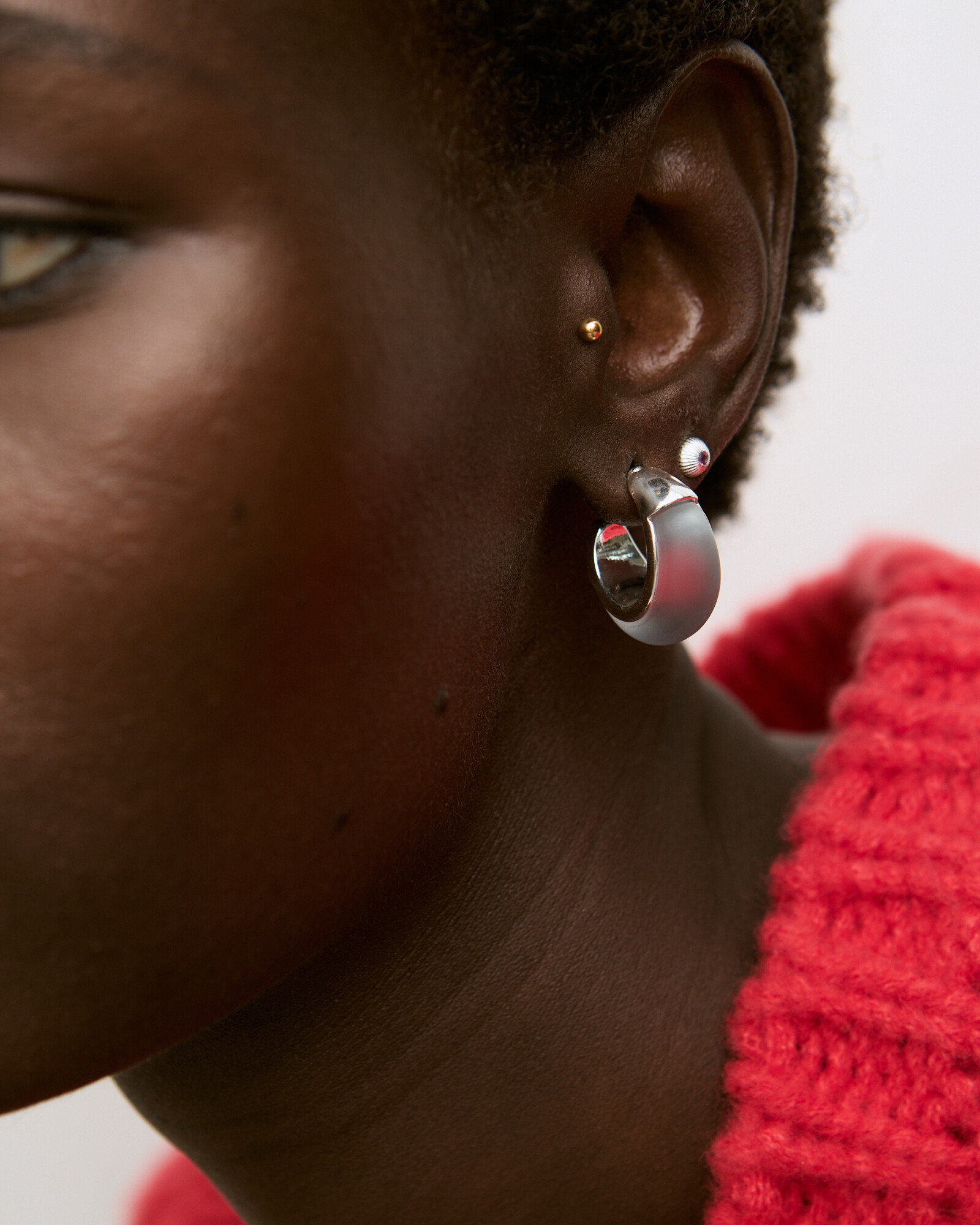 Chunky silver-toned hoop earrings with a pale lilac resin inlay.