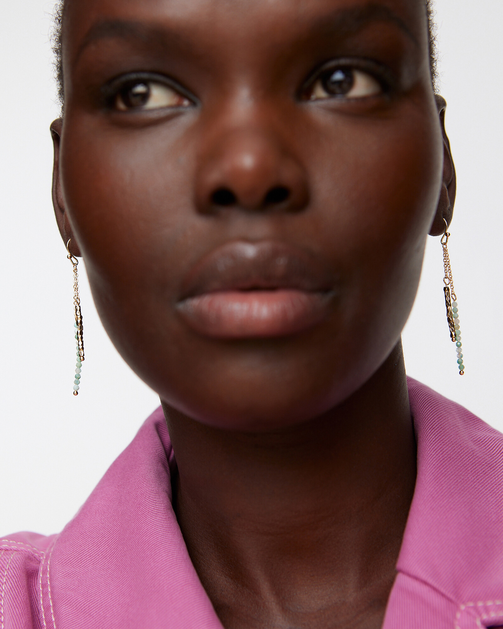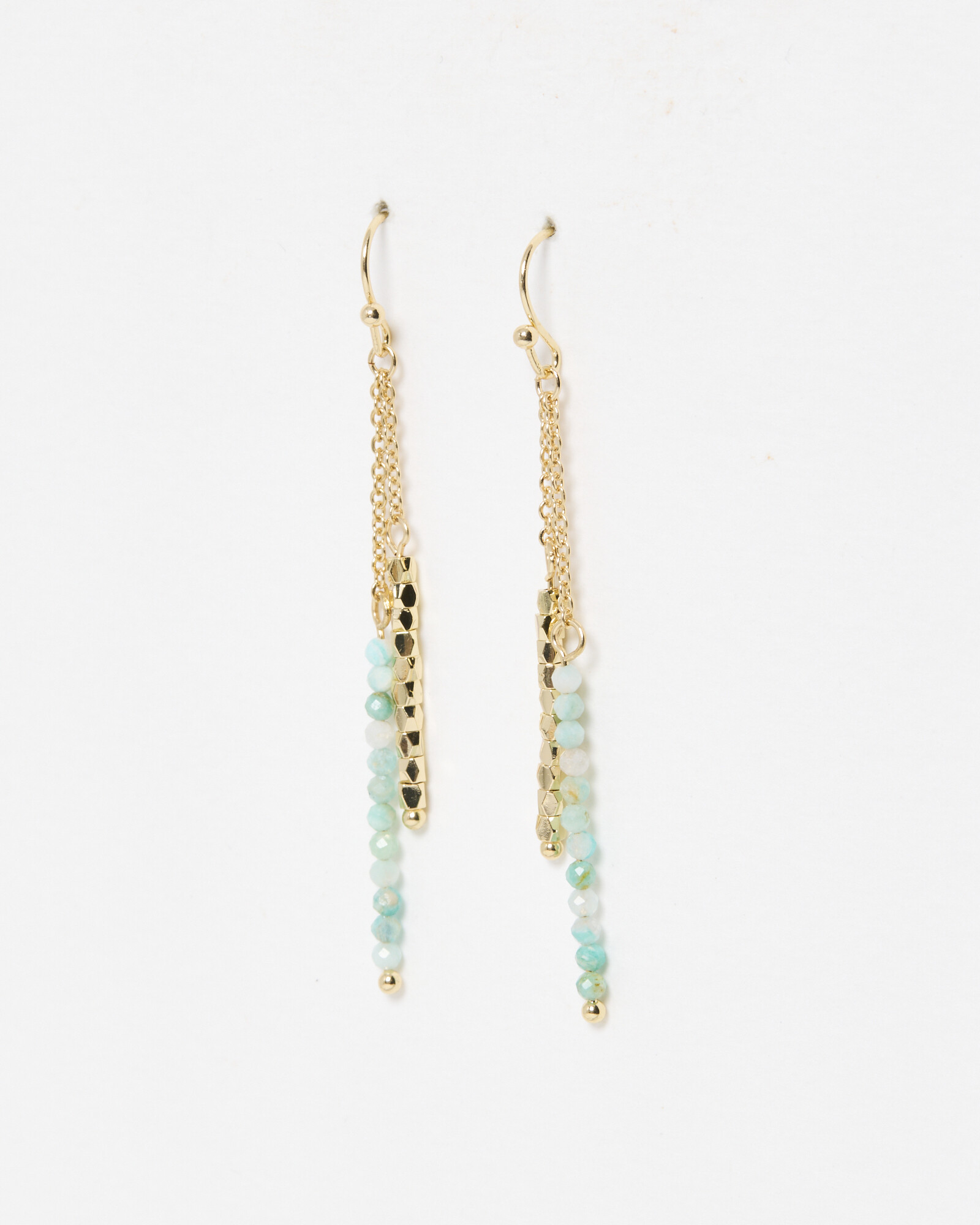 Golden hook earrings with chain tassels threaded with blue and gold beads.
