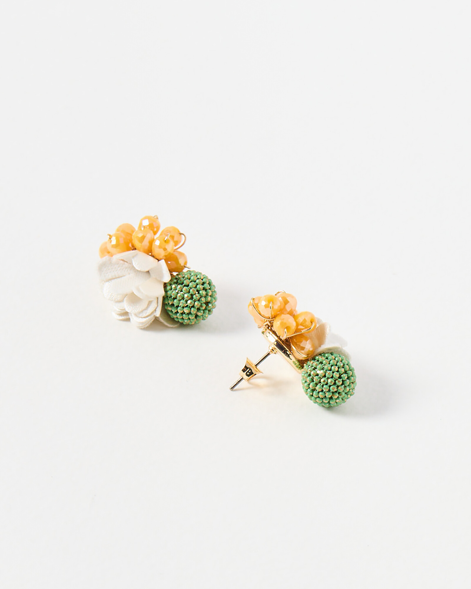 Fruit bowl statement earrings beaded in a green, white and orange design. Features a stud back for comfortable, easy wear.