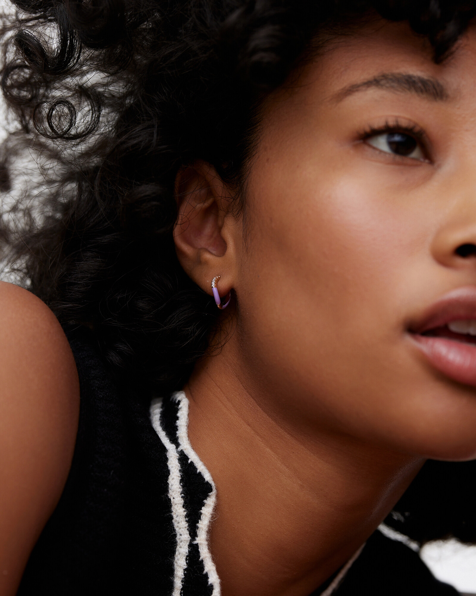 Rose gold hoop earrings with a purple enamel inlay and tiny gem details.