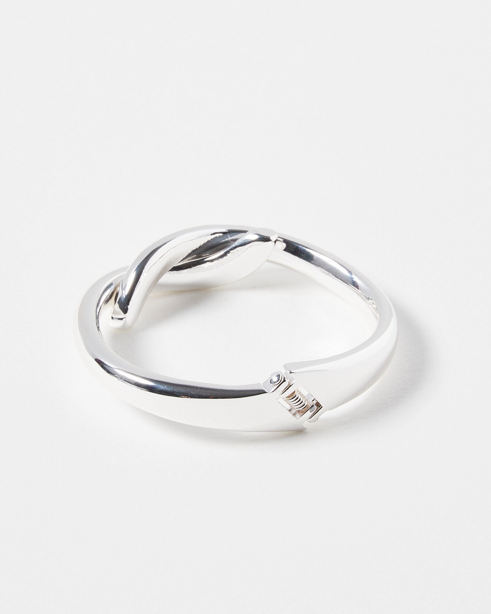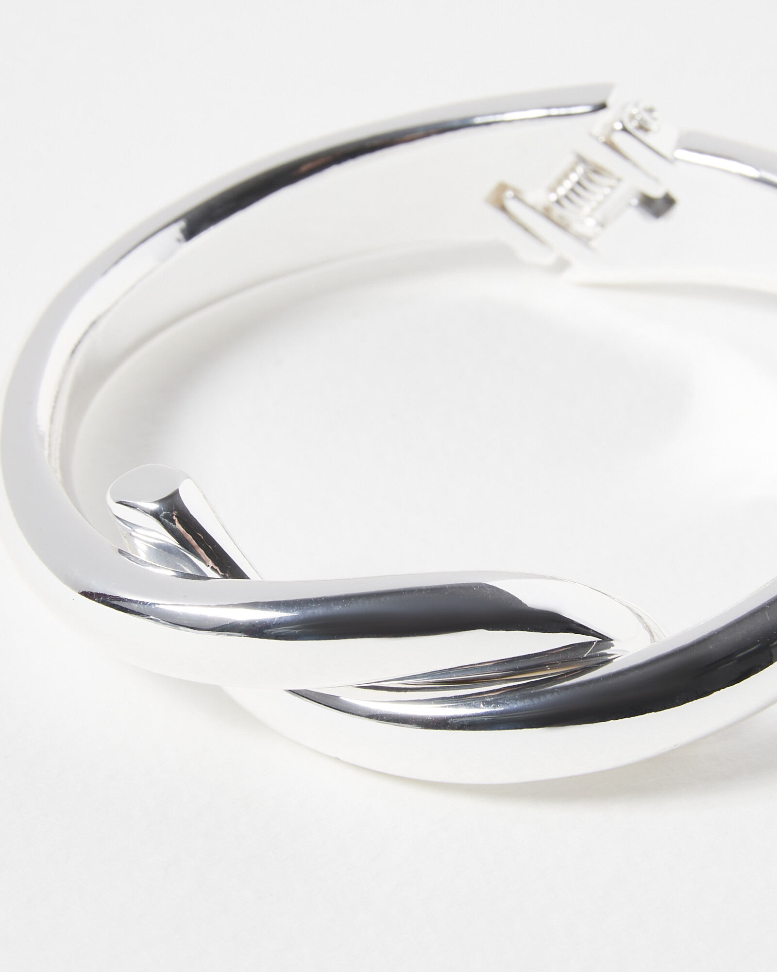 In a super chunky profile, add this statement piece to your wrist and update your jewellery collection. Featuring a twisted profile and cross over pattern, it's finished in a shiny silver tone.