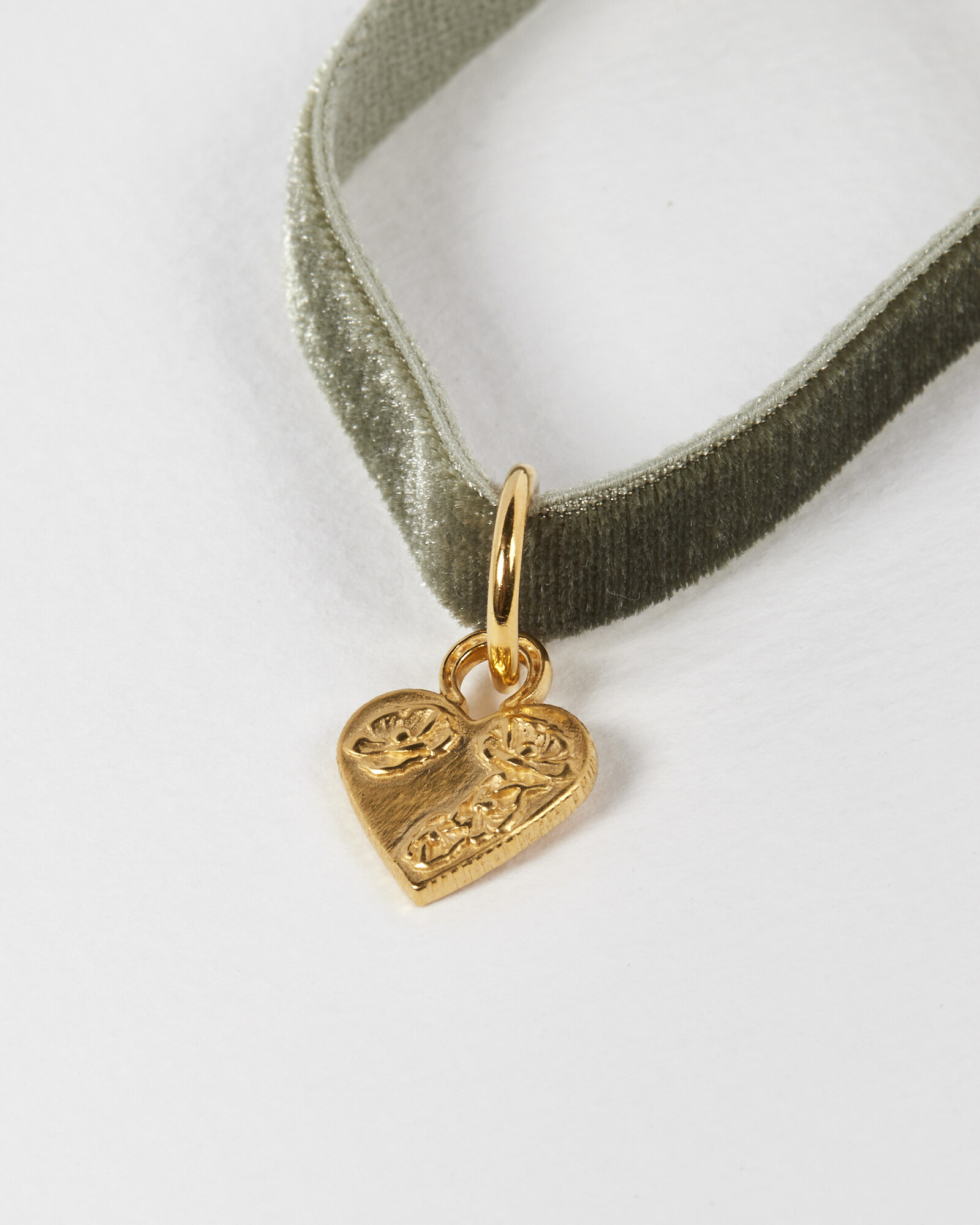Gold plated heart charm with floral details and green velvet bracelet strap. The heart charm has the hallmark on the back and hangs from a handmade ring. All Mikaela Lyons' jewellery comes with an authenticity hallmark card, detailing the marks and their meaning.