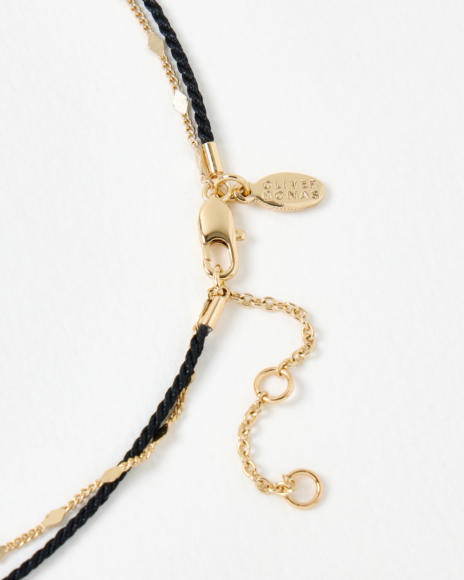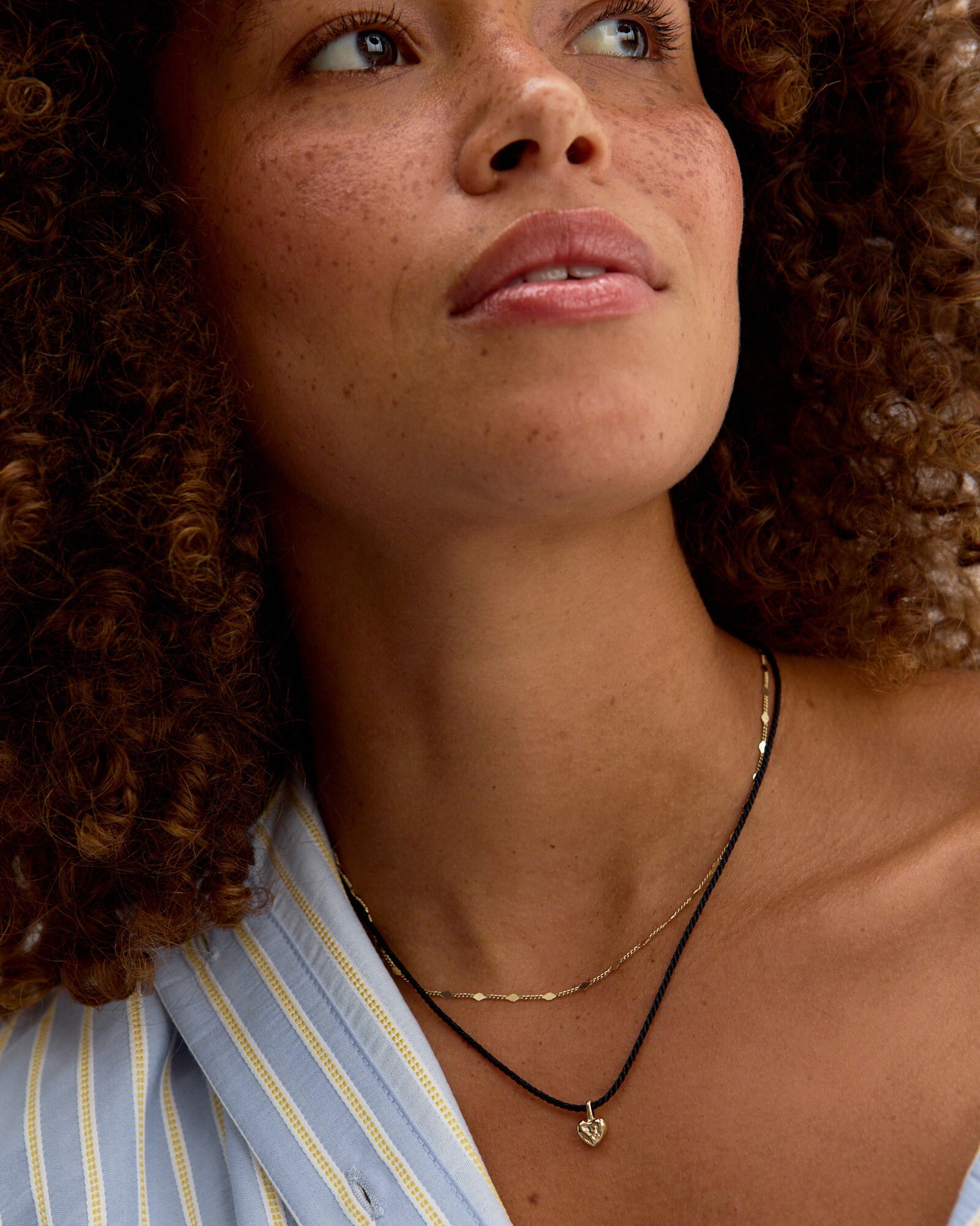 Gold tone double row necklace with a short textured curb chain, and a long cord necklace strung with a tiny heart pendant. This black cord necklace is perfect for complimenting everyday summer styles, whether wearing on holiday, to the beach or to a party. With a twisted black cord and lightly hammered finish, this layered necklace is sure to become a jewellery staple, and has been finished with an adjustable closure for easy wear. Style with the matching Misha Cord Bracelet and Anklet to complete the collection.