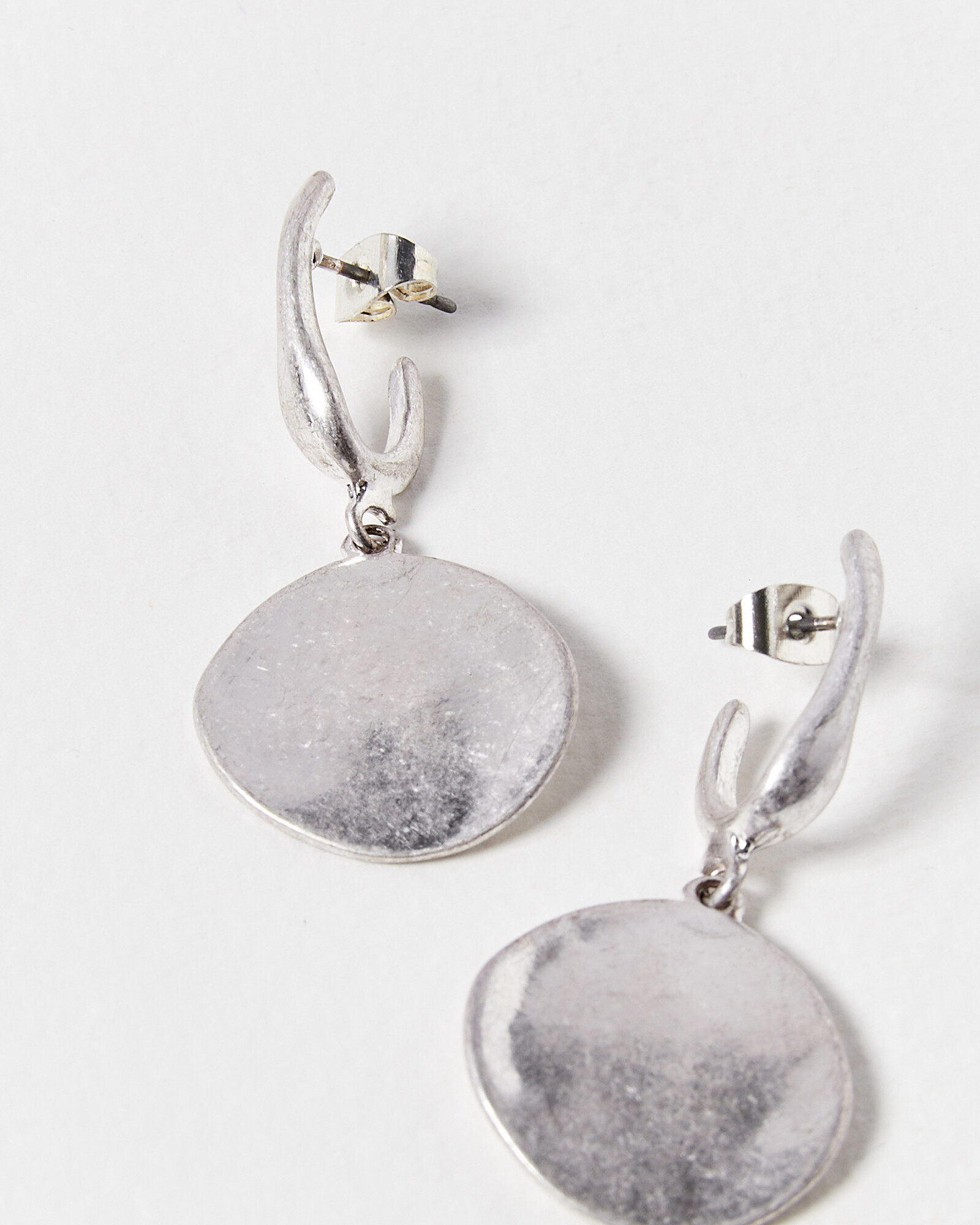 Silver-toned hoop earrings with a large disc charm drop and stud earring backs. These hoop earrings have a brushed, matte finish.