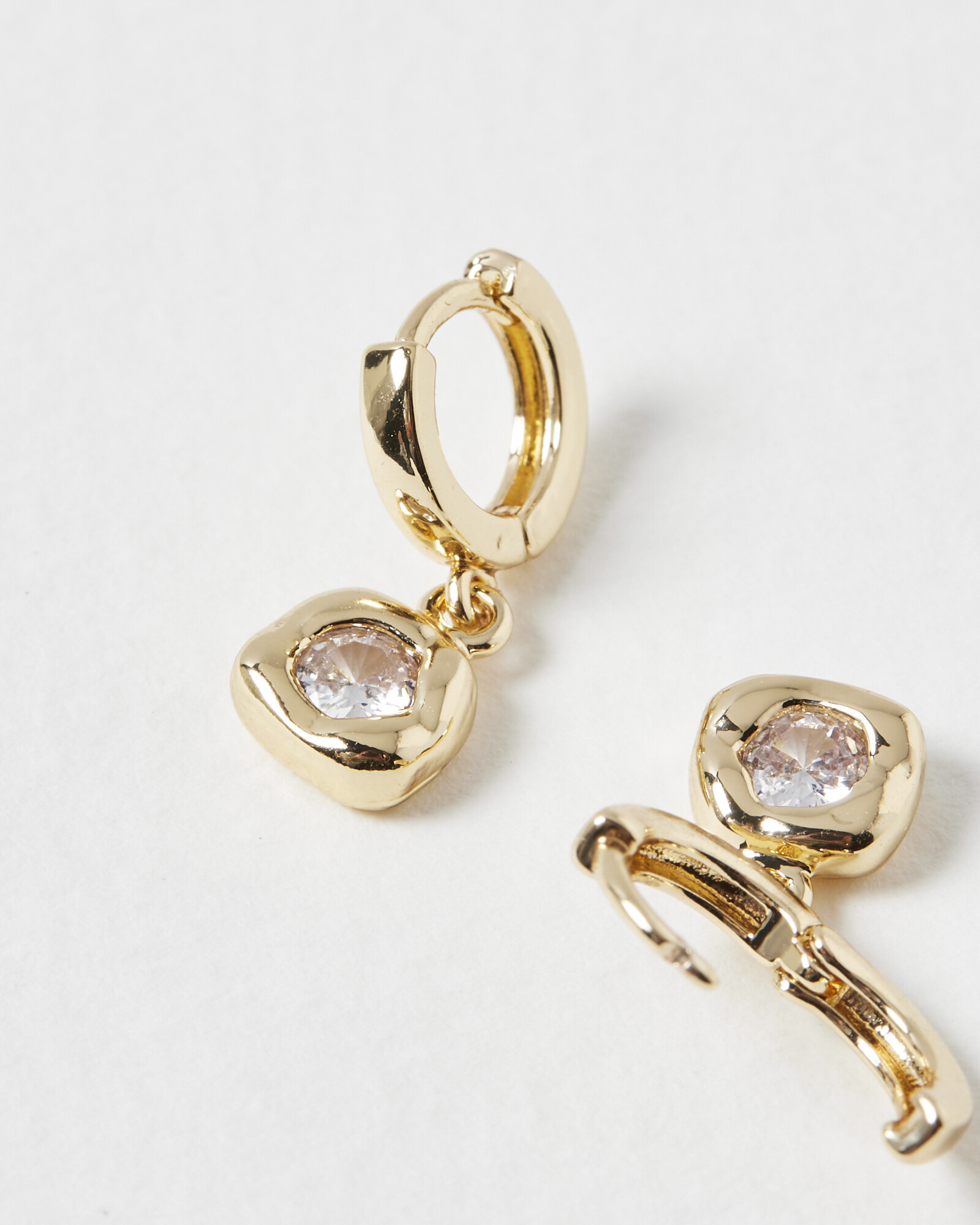 Golden huggie earrings with an organic shaped pendant inlayed with a clear gem.