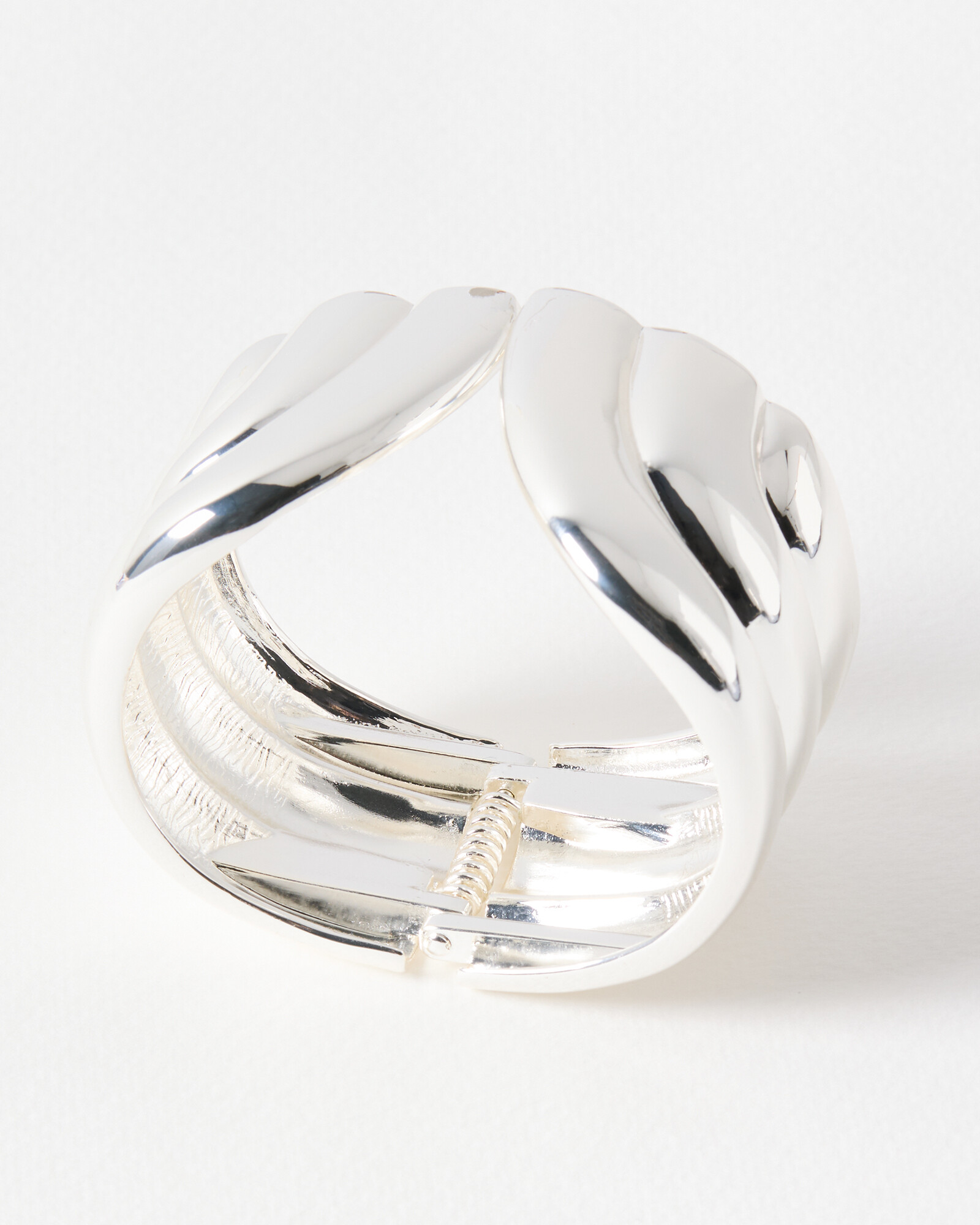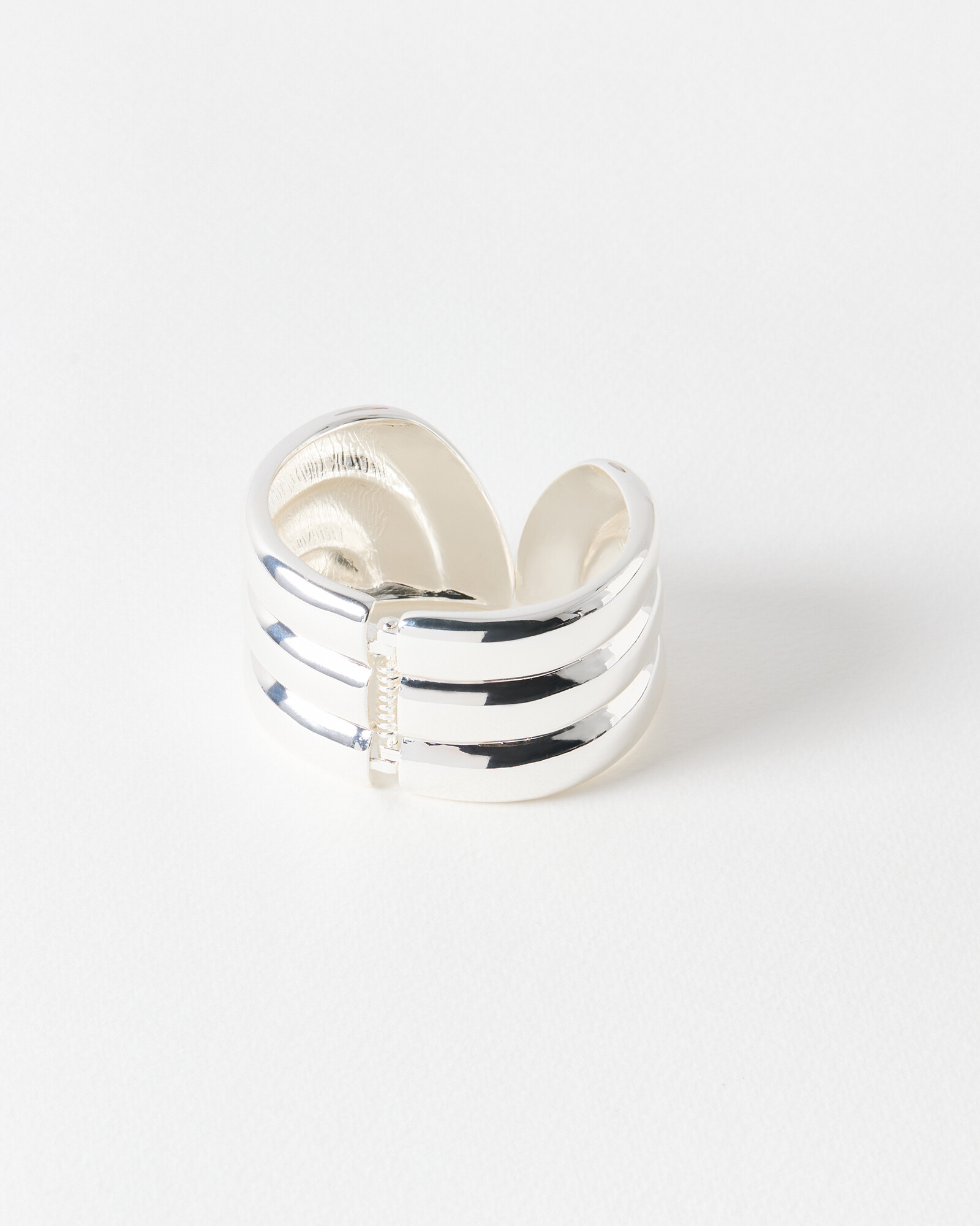 Chunky cuff bangle in a silver-toned metal with a hinged, curved profile, and a trio of engraved lines that flow with the design. Wear over long sleeved tops for added interest, or style alongside other silver jewellery pieces for a statement look.
