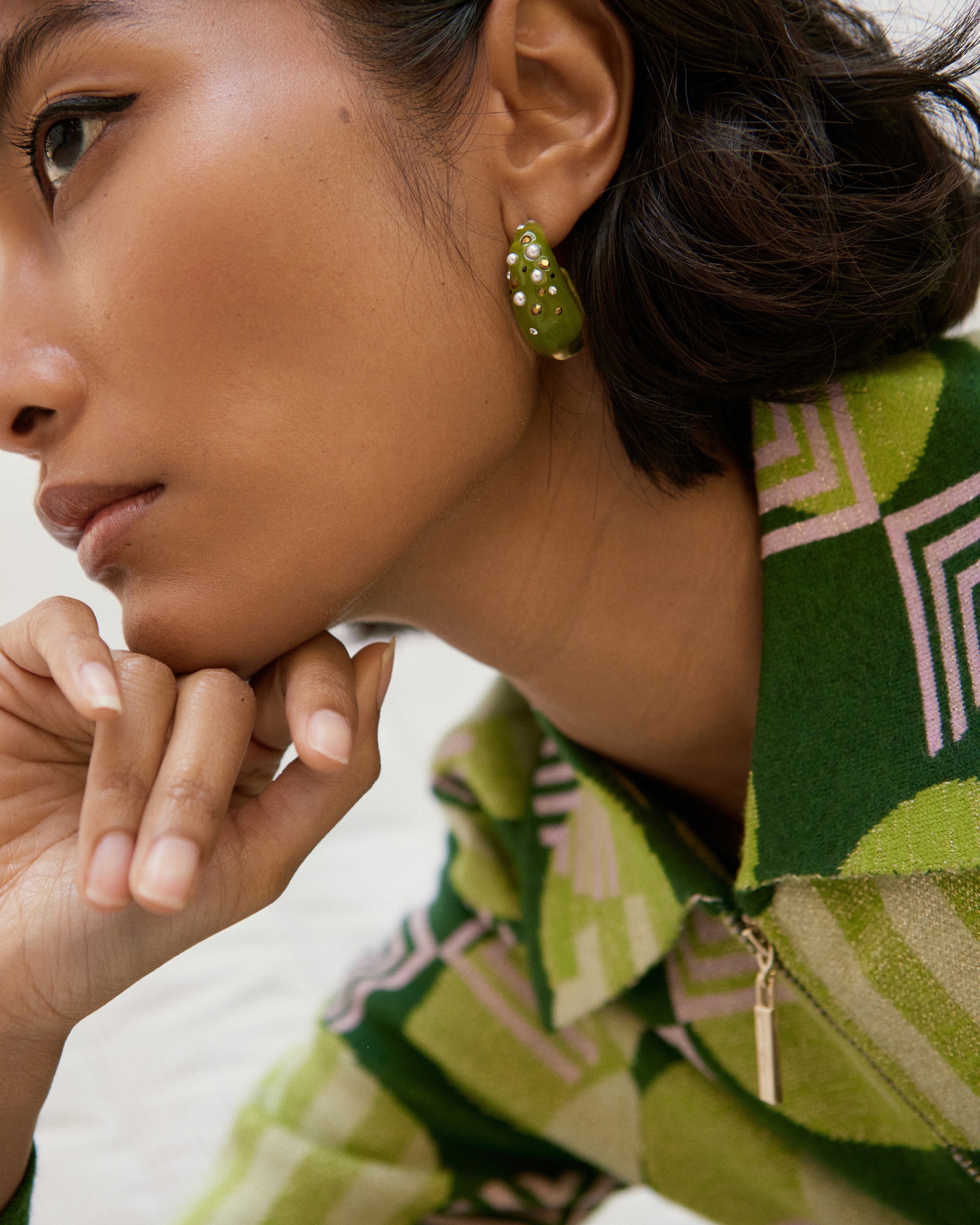 perfect way to mix and match texture. On-trend resin pieces offer a fusion of their classic glossy material with metal chains or bands, all presented in a vibrant, candied colour palette and adorned with pearls or beads in playful shapes. Decorate your lobes with statement earrings, or add colour to your collar with a chunky resin necklace or playful brooches.