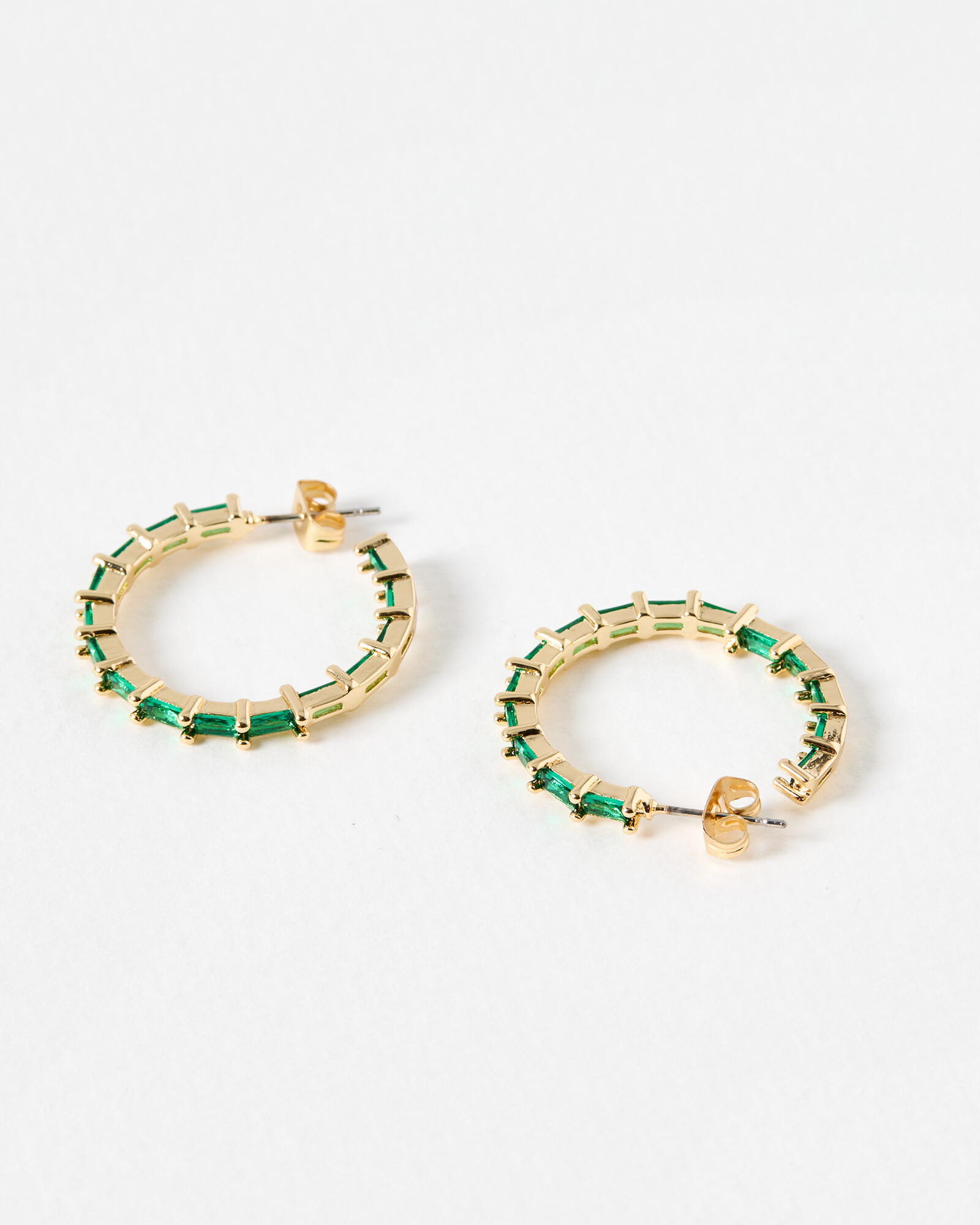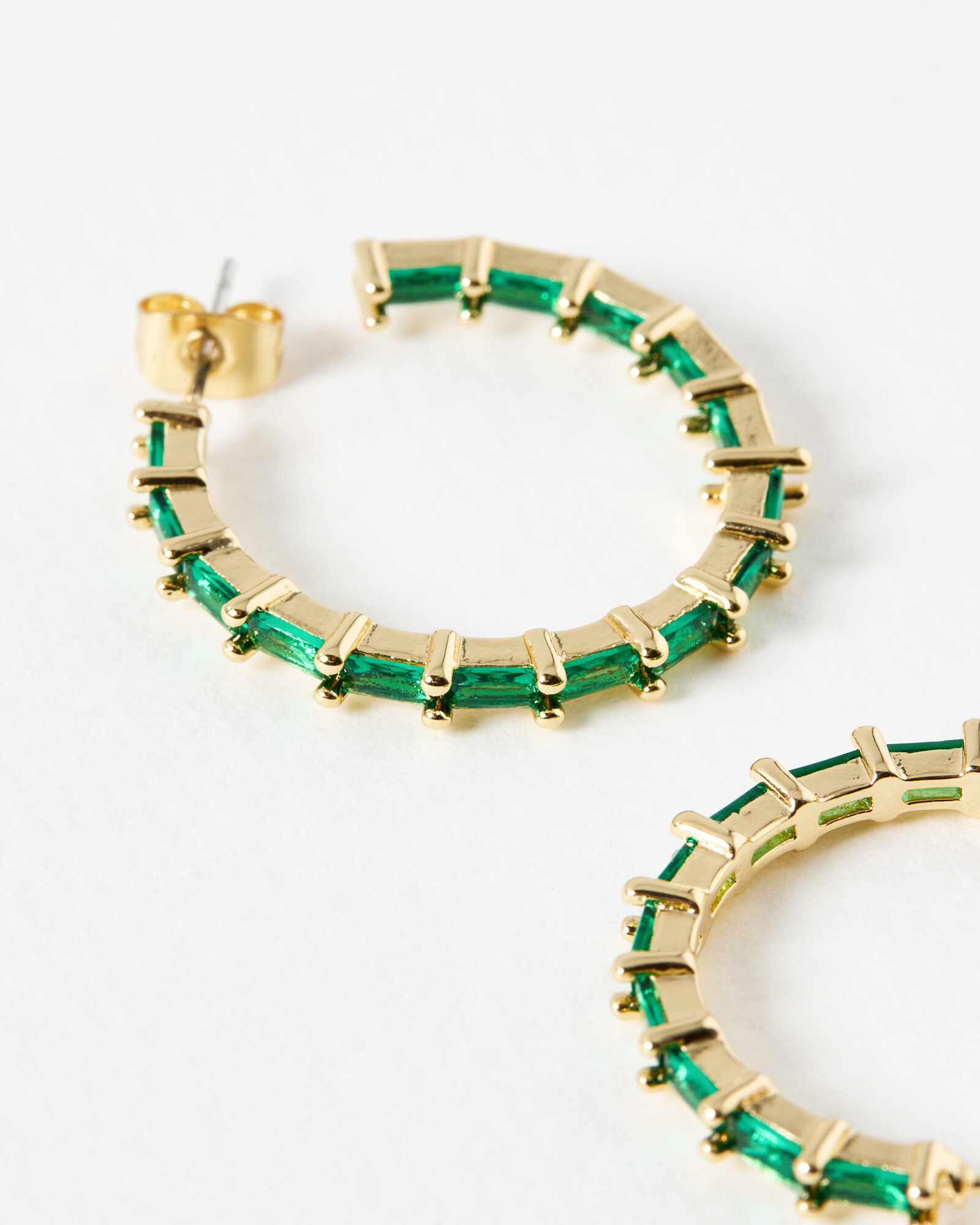 Gold toned hoop earrings with contrasting green baguette stones inlaid along the curve. Pair with matching green and gold jewellery for a cohesive look, or style with your party outfits for a pop of colour.