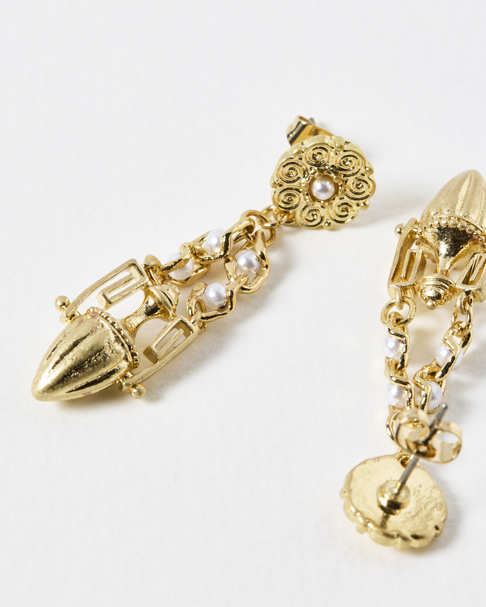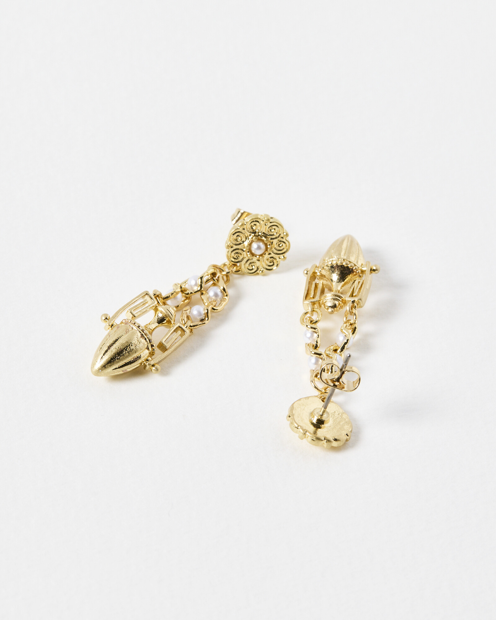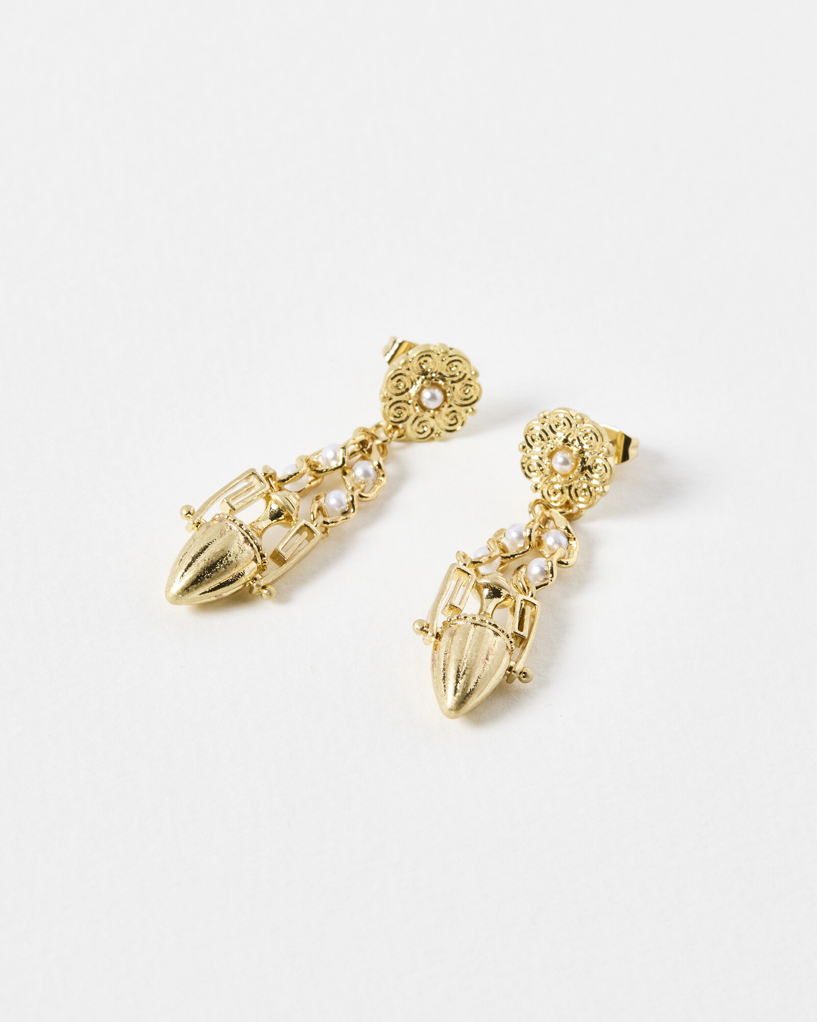 Golden drop earrings with faux pearls, engraved markings and a small vase charm.