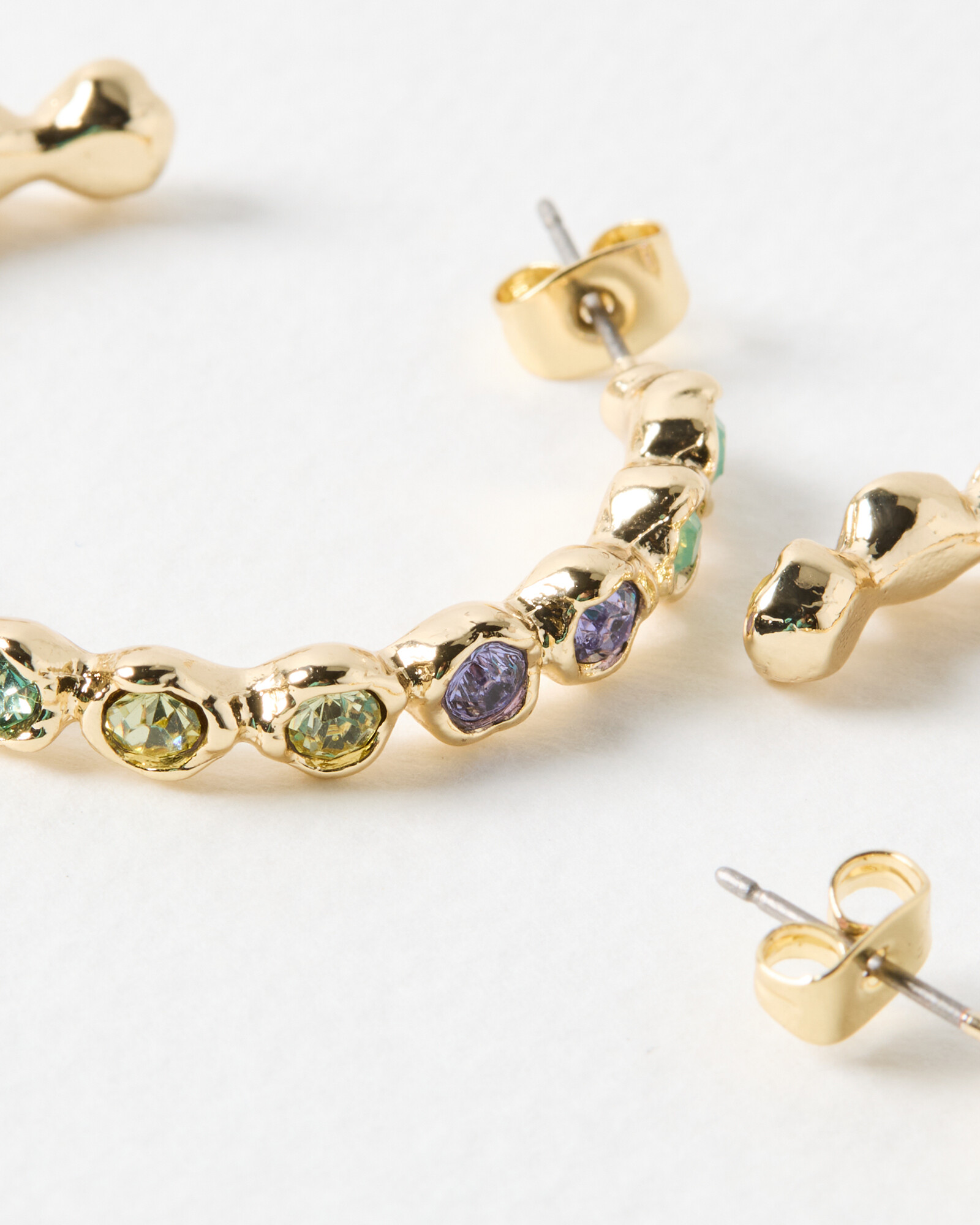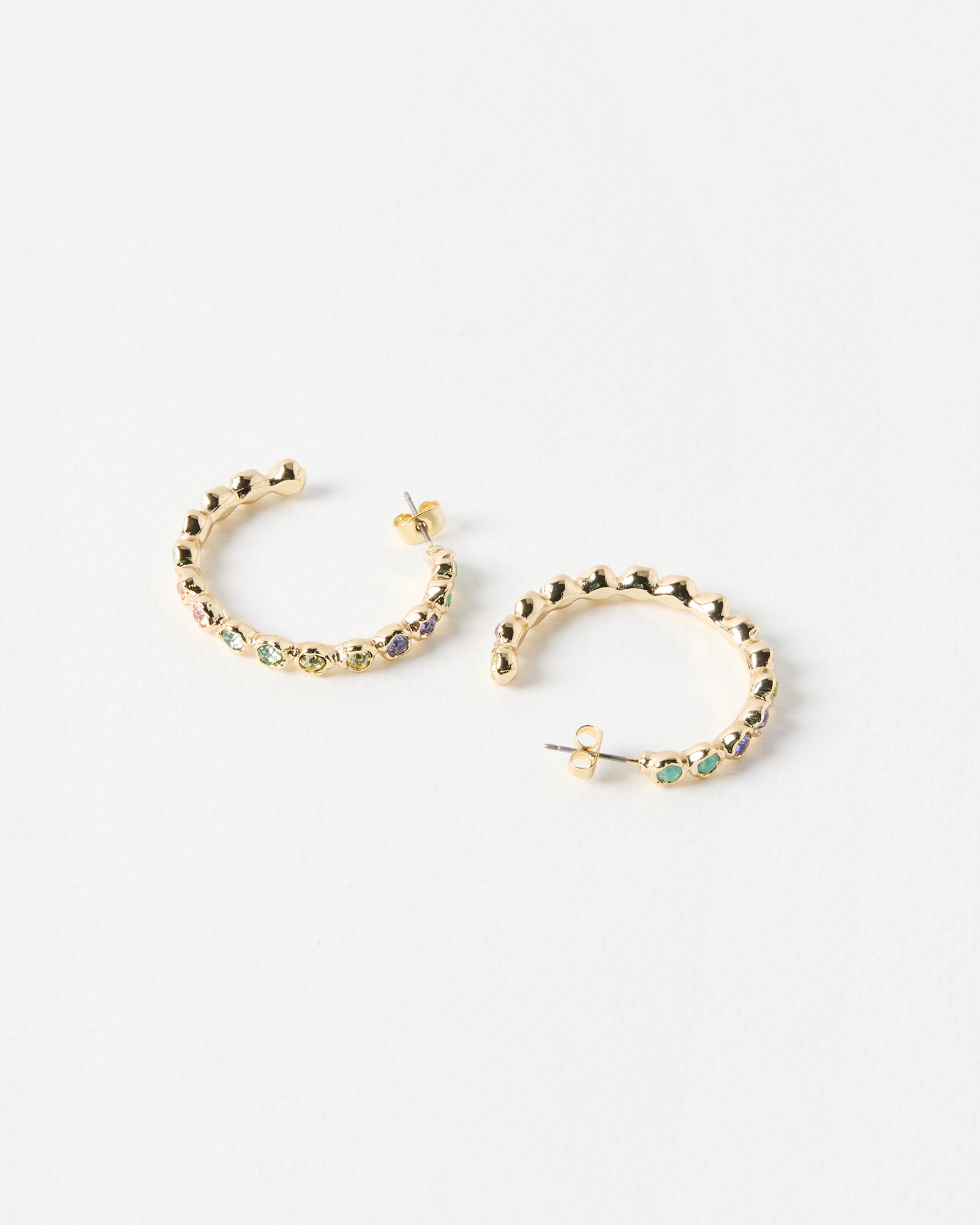 Slim, textural hoop earrings in a gold tone metal inlayed with small colourful stones. Finished with a shiny surface and simple stud back, ideal for summer or festival styling.