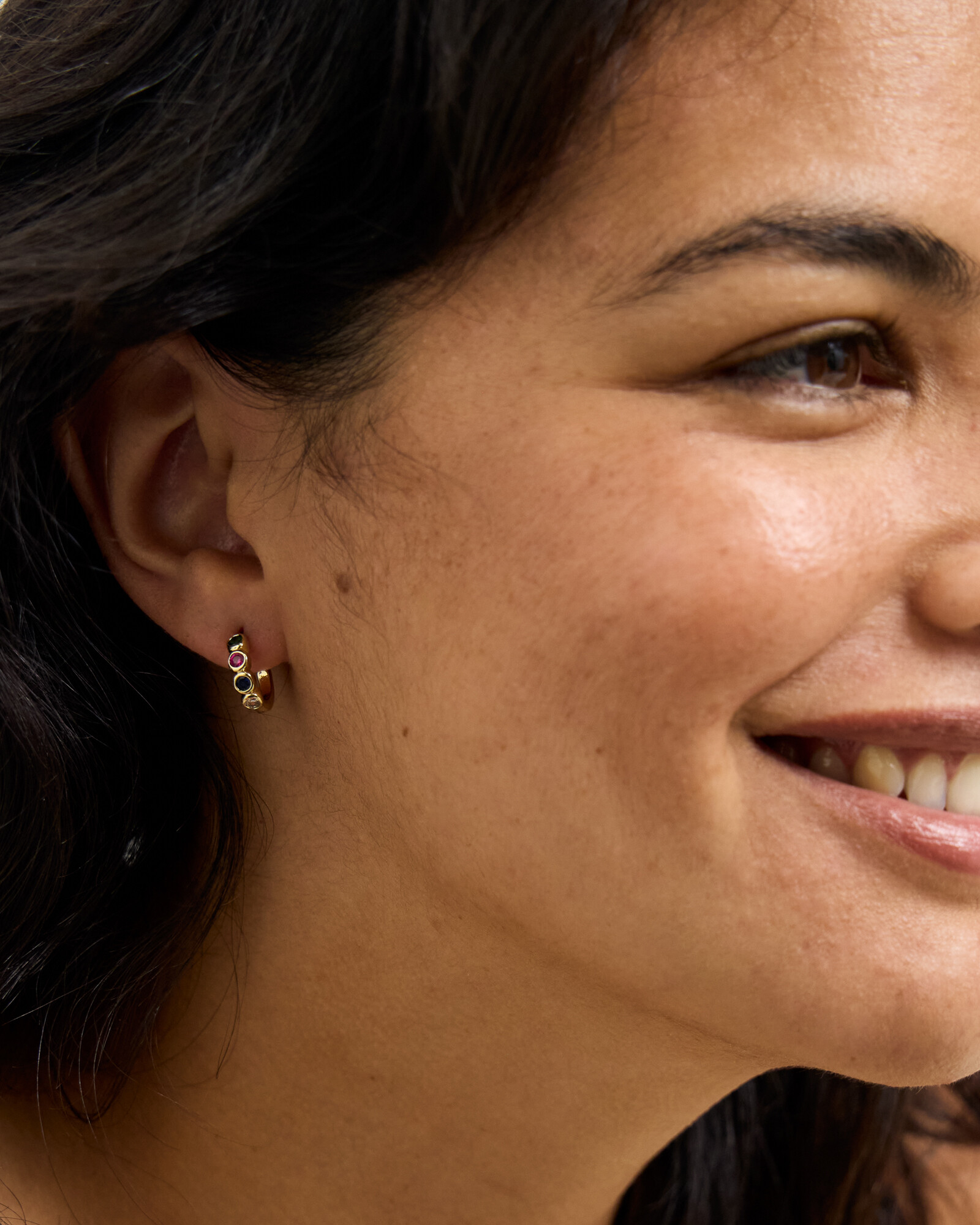 Small gold-toned hoop earrings with rainbow coloured gem inlays and a stud earring back.