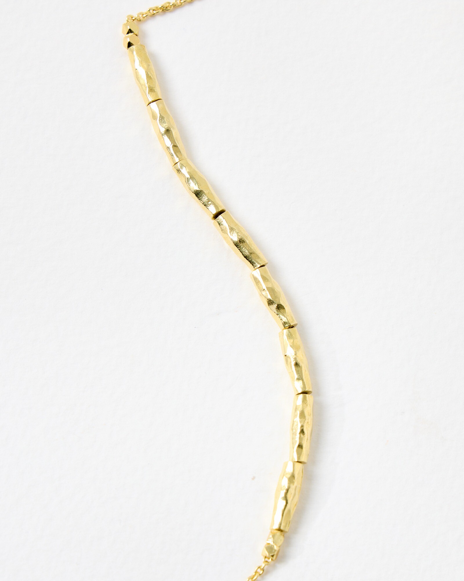 Our gold jewellery is coated in approximately one micron of 10-carat gold plate on a brass base. We use gold plating to keep our pieces both high quality and affordable, for long-term wear. For more information about the materials we use in our jewellery, read our jewellery material guide.